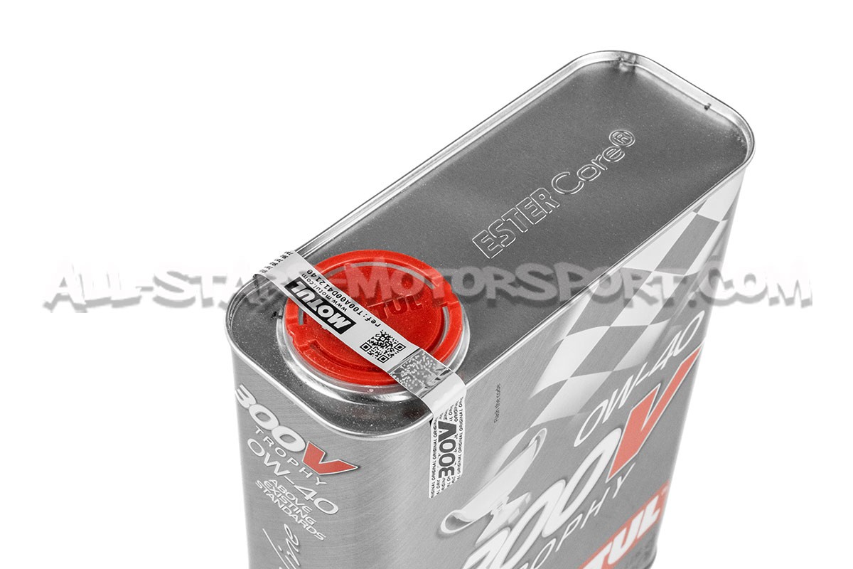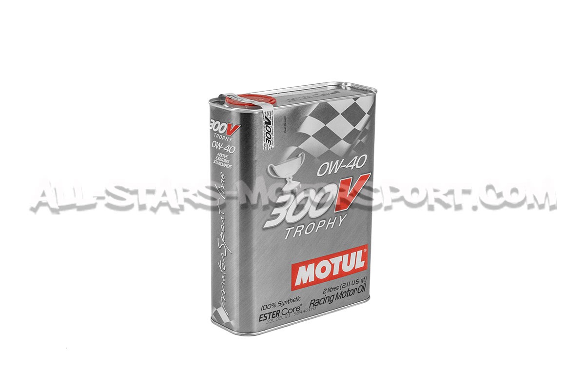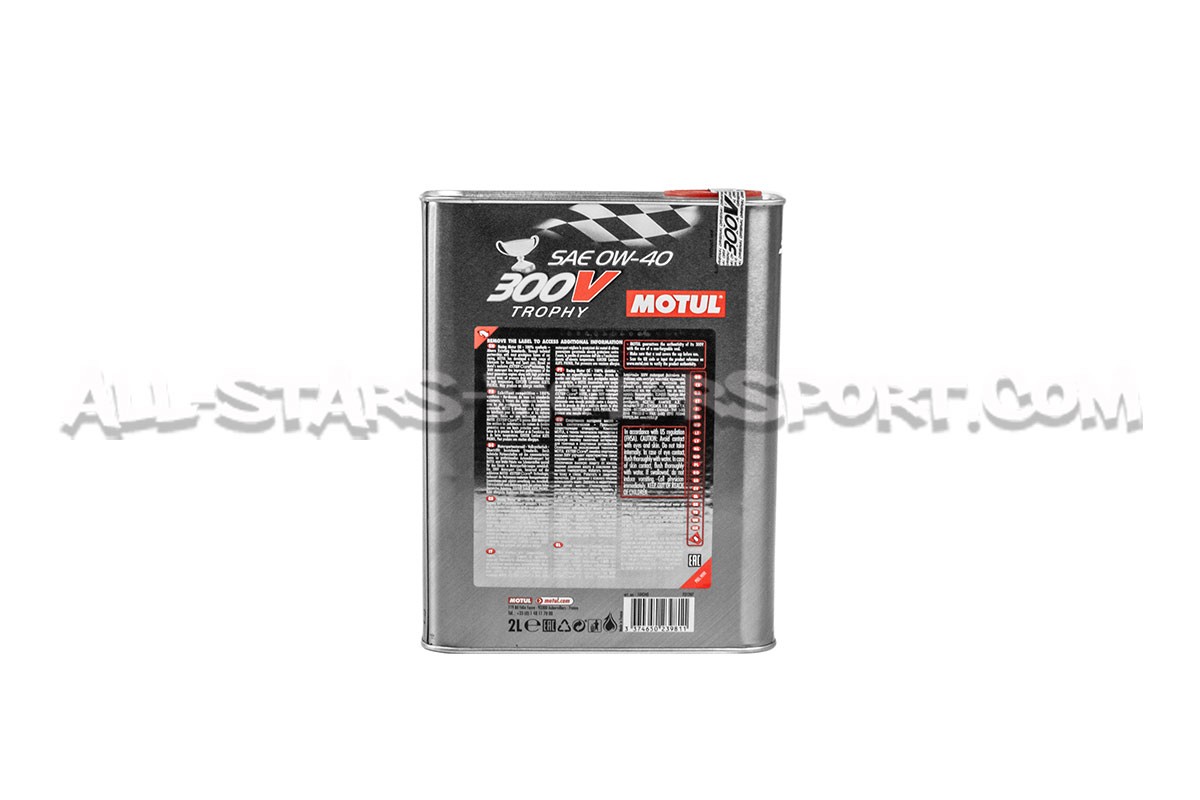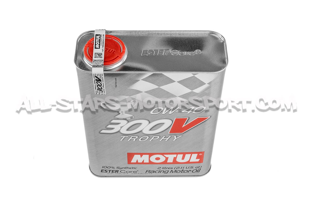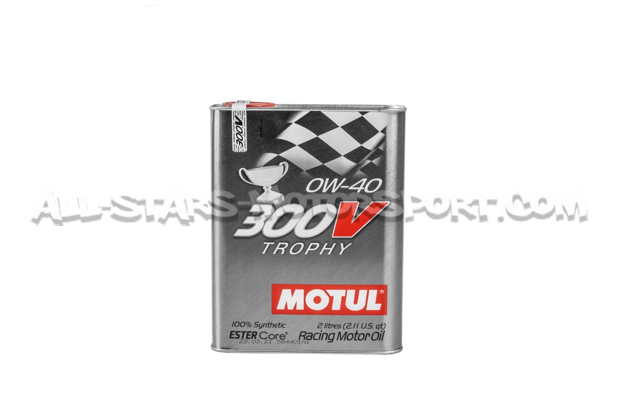 Available as a 2-litre can, Motul 300V Trophy engine oil has an SAE viscosity grade of 0W40 and a 100% synthetic structure offering optimum lubrication capacity and protection for both original or highly tuned engines. With particularly homogeneous protection index at hot and cold temperatures, this high-performance oil will protect the sensitive areas of the engine by depositing a thick oil film when hot but sufficiently fluid when cold, meeting the needs of moderns high-performance engines and / or hard driving.