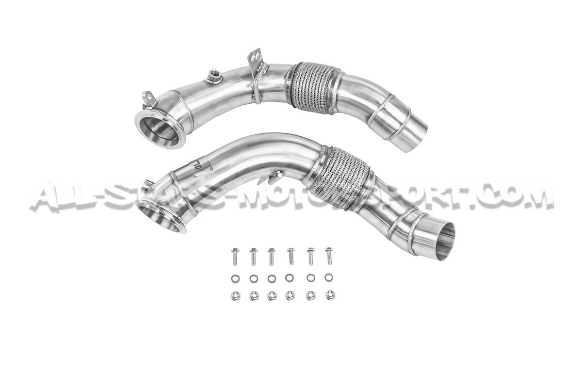 These stainless steel made Alpha Competition decat downpipes, in 3.5" / 89mm diameter, fit without modification between the turbos and the front pipes of the S63 engines fitted to the BMW M5 F10 / M6 F1x in order to remove the OEM catalysts. Manufactured from high quality T304 stainless steel with handmade TIG welds, these downpipes will bring a particularly aggressive sound and an average gain of 28hp on a stage 1 tuned engine. With a high flow structure able to support over 1000hp, these Alpha Competition decat downpipes clearly represent the best value for money on the market !