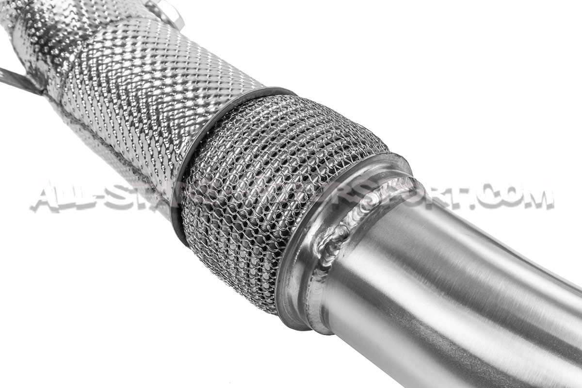 The CTS Turbo decat downpipes for Audi RS6 C7 and RS7 C7 fits as a direct replacement for the standard primary catalytic converters in order to unleash the full power of the 4.0 TFSI engine. Made of T304 stainless steel with TIG welding, these downpipes have a specific heat shield and will bring a significant gain in power and sound !