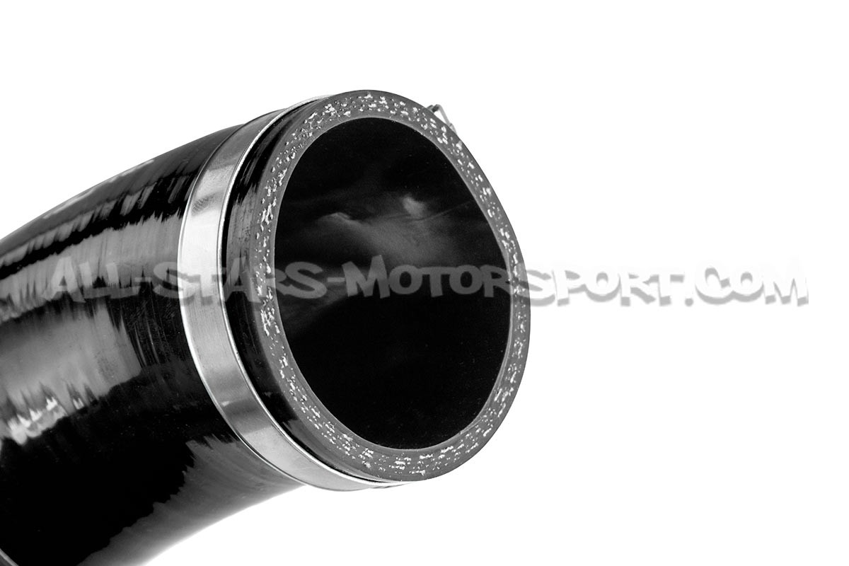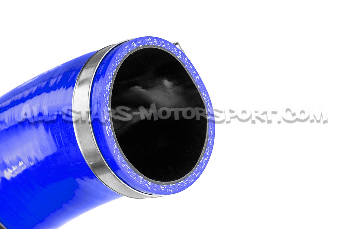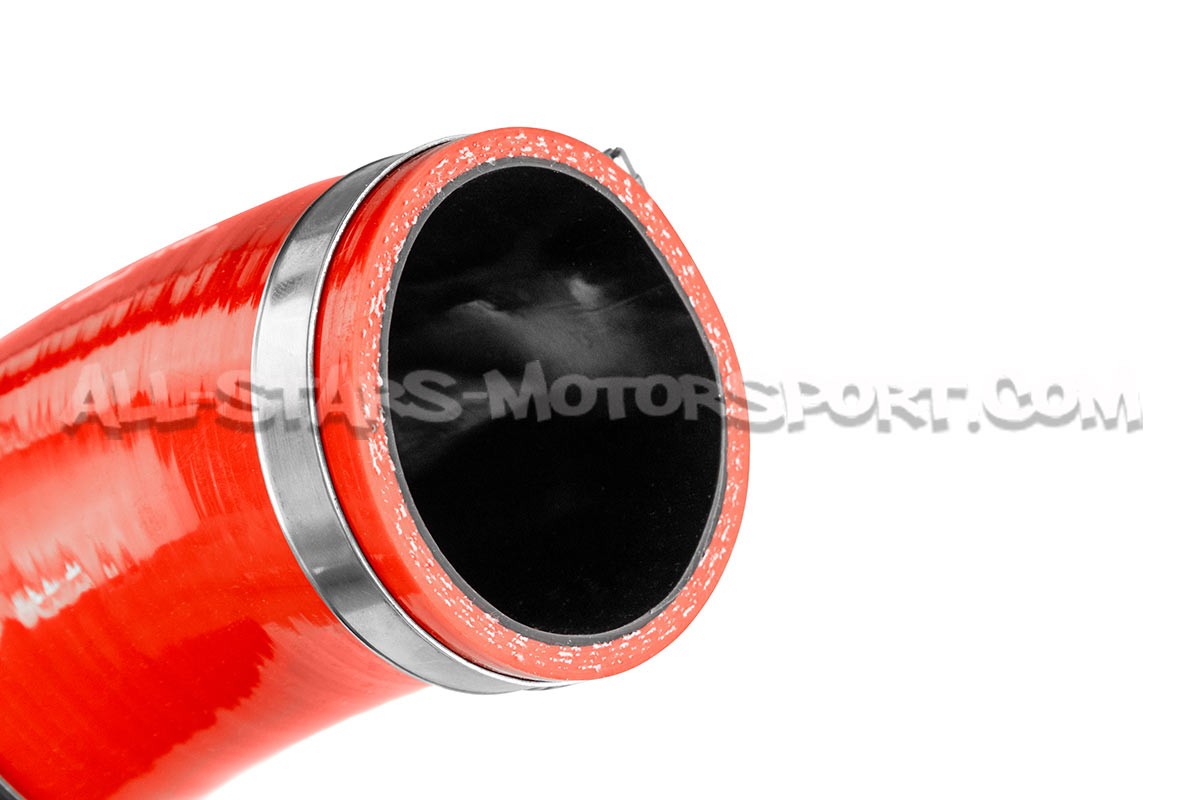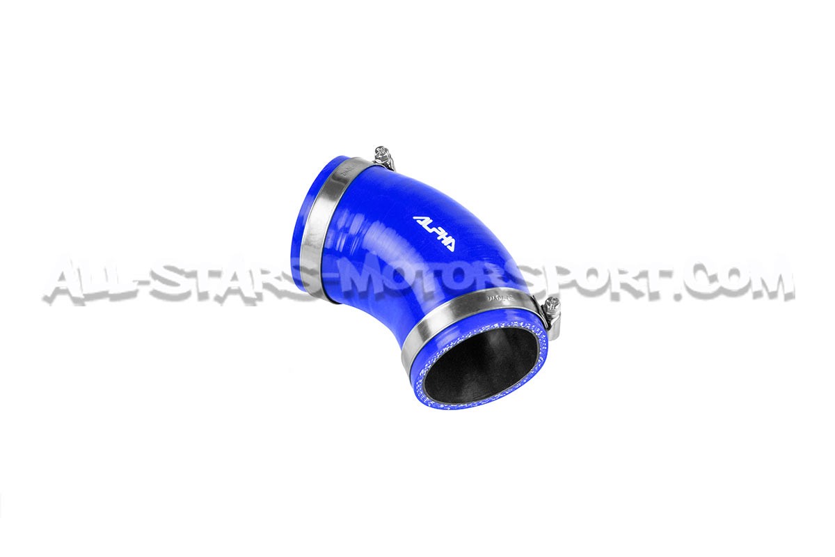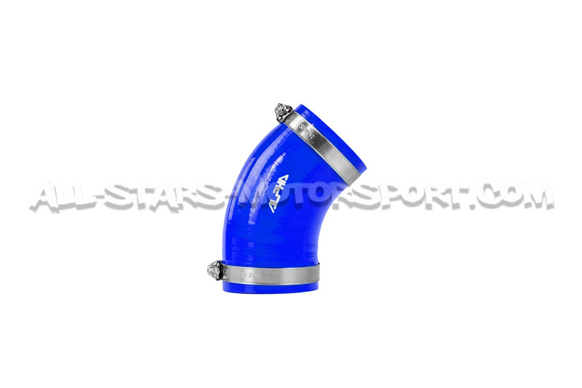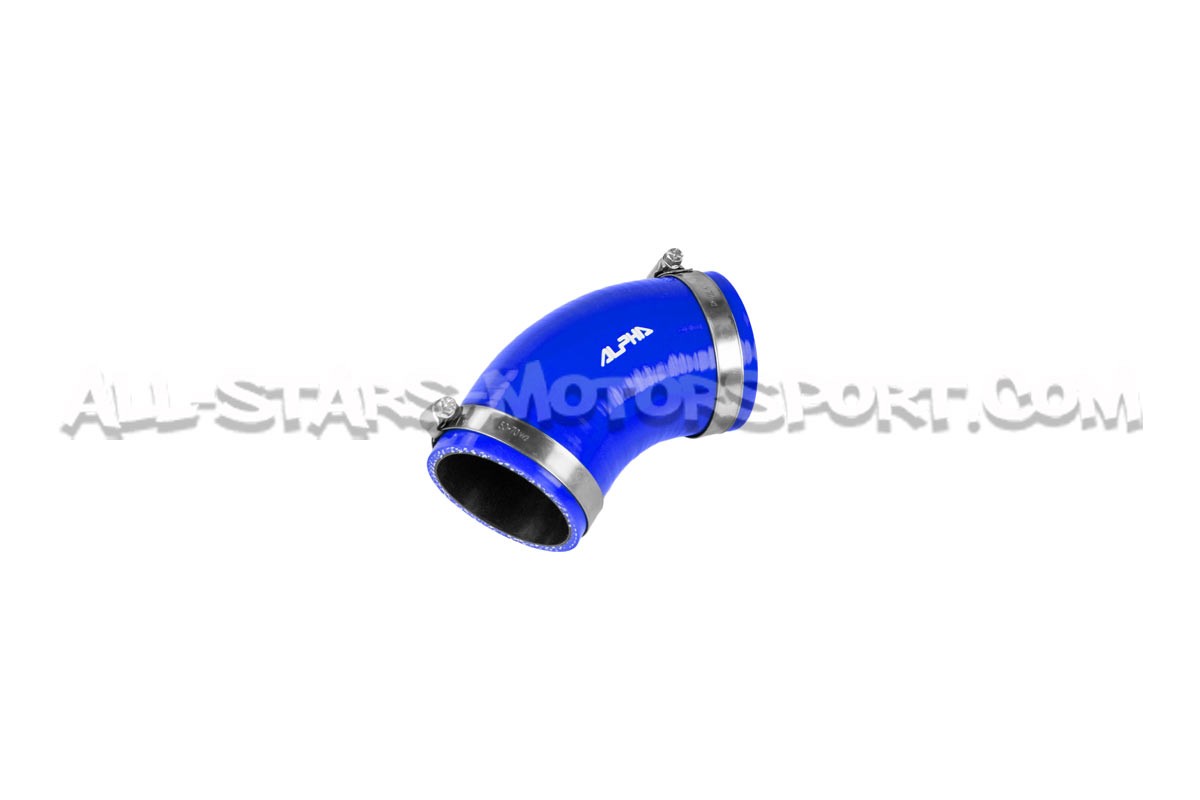 This Alpha Competition reinforced silicone throttle body hose available in blue, black or red for the 2.0 TFSI EA113 engine of the S3 8P, Leon 2 Cupra, Golf 5 GTI or Golf 6 R, fits without any modification as a direct replacement for the OEM coupler, in order to provide more reliability to the boost circuit with its reinforced multilayer structure resistant to extreme temperatures and pressures.