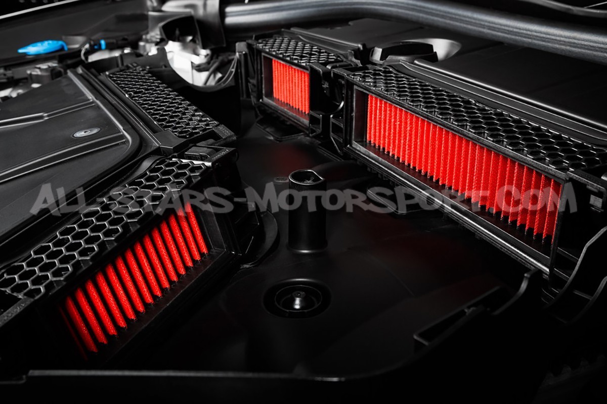 This Eventuri intake system for the S58 engine of the BMW X3M F97 and X4M F98 features a carbon fiber airbox lid, 4 high flow air filters, carbon fiber air scoops and all required hardware for easy and direct installation. This unique intake system finished in high glossy carbon fiber shown a great 11 hp dyno proven gain on stock engine !