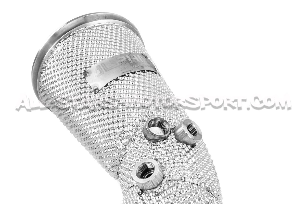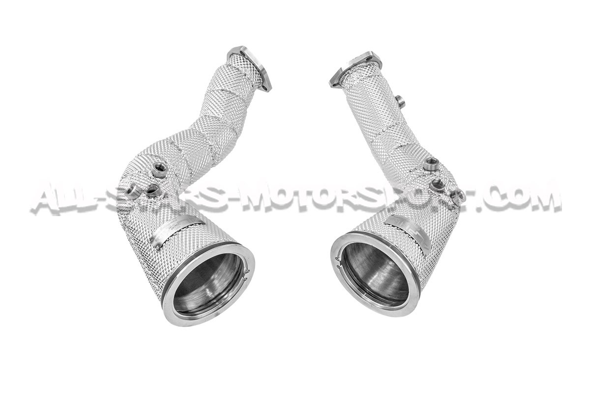 These Alpha Competition downpipes with stainless steel decat in 5" / 130mm diameter reduced to 3.15" / 80mm fit without modification between the turbos and the front pipes of the 4.0 TFSI engines fitted to the Audi RS6 C8 and Audi RS7 C8 (with OPF). Made of high quality T304 stainless steel with handmade TIG welds and featuring a high flow structure, these downpipes are clearly the best value for money on the market !