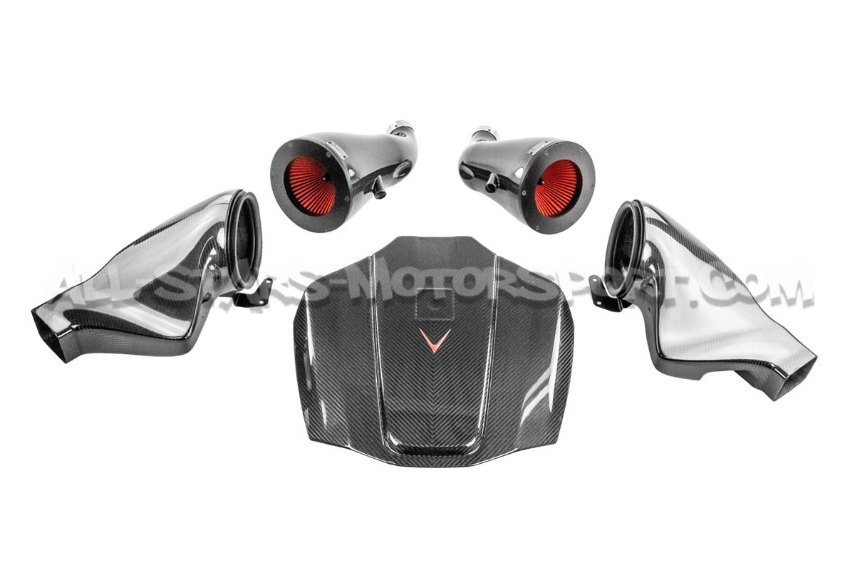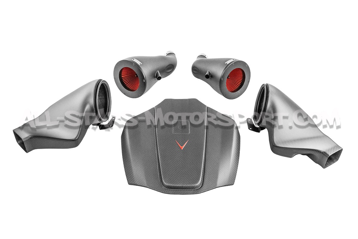 The Eventuri dynamic intake made of carbon fiber for the M178 engines of the Mercedes AMG GT / GTS / GTC / GTR consists of two large volume airboxes with washable and reusable synthetic filters, two intake ducts, a specific engine cover and everything needed for direct mounting. The efficiency and finish of this kit is as impresive as efficient thanks to a unique design that allows the system not only to increase the incoming air flow but also to keep the intake temperatures low enough to offer a great 18hp power gain on a standard engine.