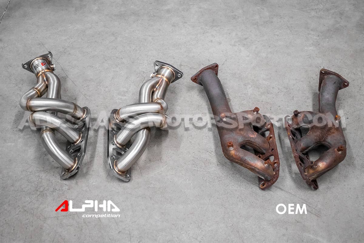 Manufactured from high quality stainless steel, these Alpha Competition exhaust manifolds fit without modification between the VQ35DE engine and the downpipes of the 03-07 Nissan 350Z. With a 38mm diameter high flow structure and handmade TIG welds, this kit of 2 manifolds offers the best quality / price / performance ratio on the market.