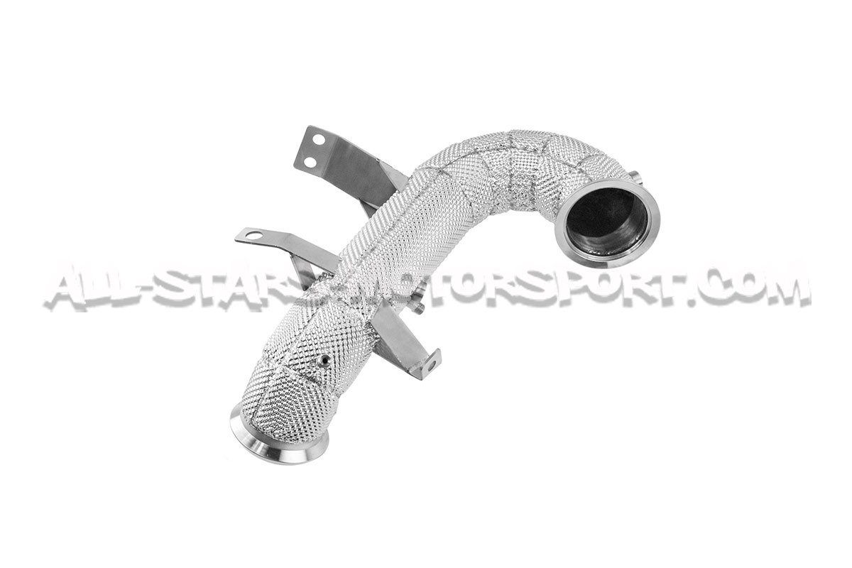This stainless steel made Alpha Competition, downpipe, in 3.5" / 89mm diameter, fits without modification between the turbo and the front pipe of the M139 engines fitted to the Mercedes A45 / A45S / CLA45 AMG W177 / C118 in order to remove the main catalyst. Manufactured from high quality T304 stainless steel with handmade TIG welds, this downpipe will bring an average gain of 28hp on a stage 1 engine and a particularly aggressive sound. With a high flow structure and thermal insulation to reduce heat radiation by 50%, this downpipe clearly represents the best value for money on the market!