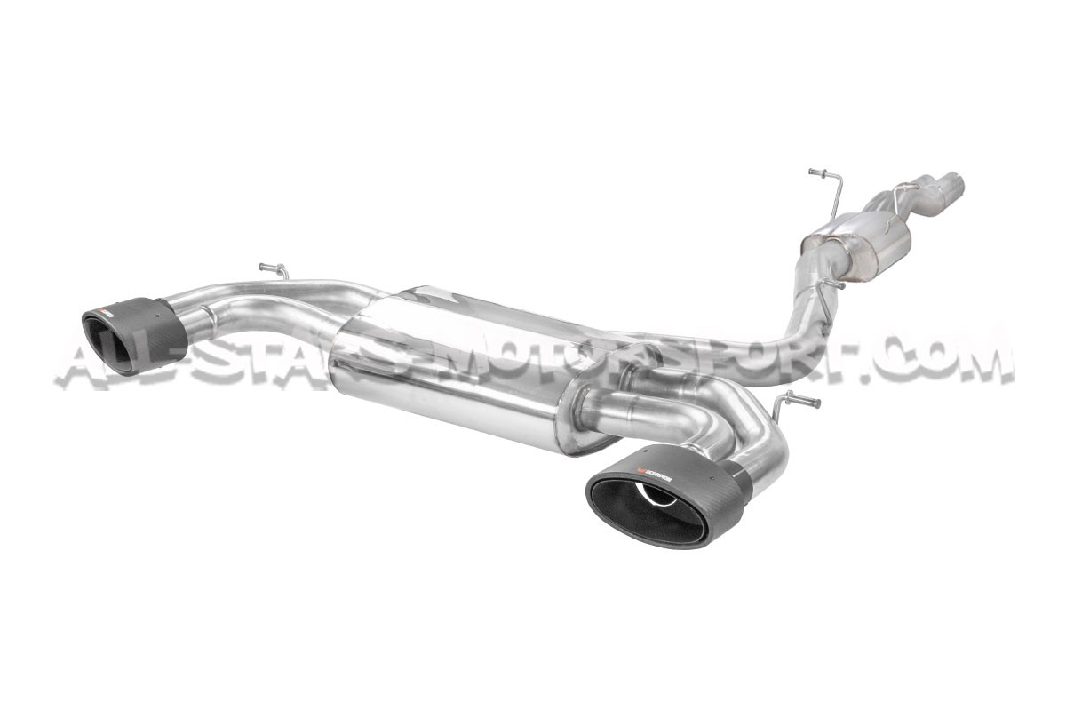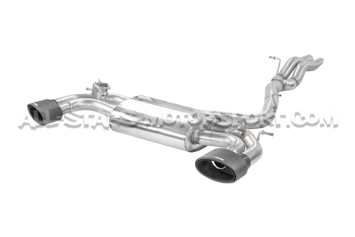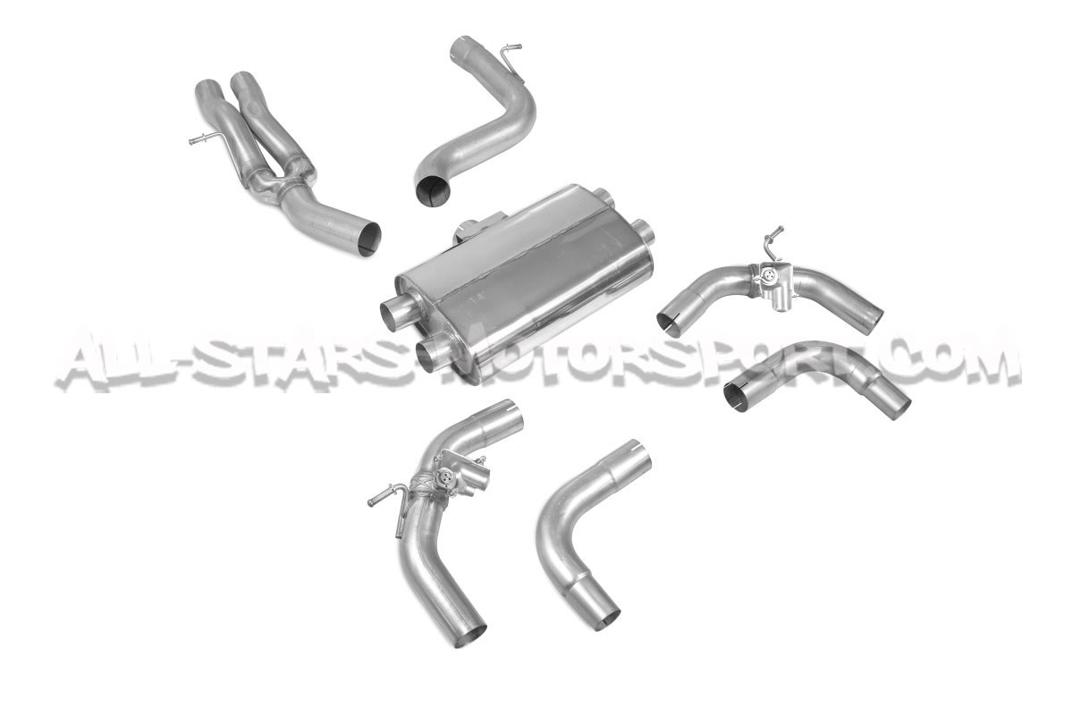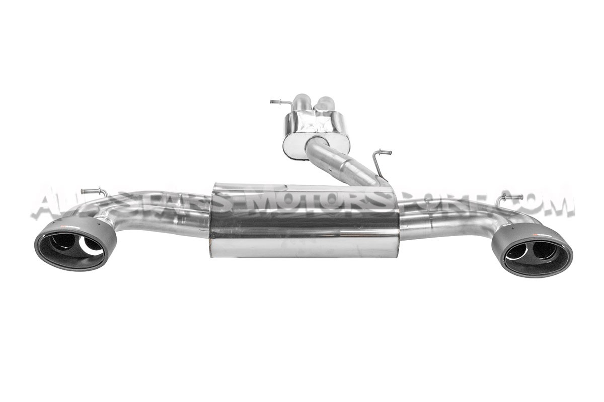 This Scorpion catback exhaust system, made from 3.15"/ 80mm stainless steel pipes with Evo Ascari carbon fiber tailpipes, fits without modifications on the Audi RS3 8V 15-17 and is available with or without exhaust valves that work with the sports mode as standard and with or without a central pipe equipped with a resonator that allows drone reduction at constant speed.