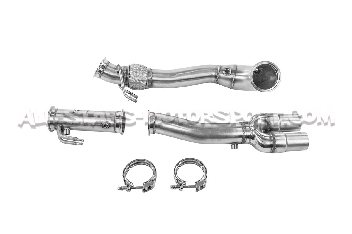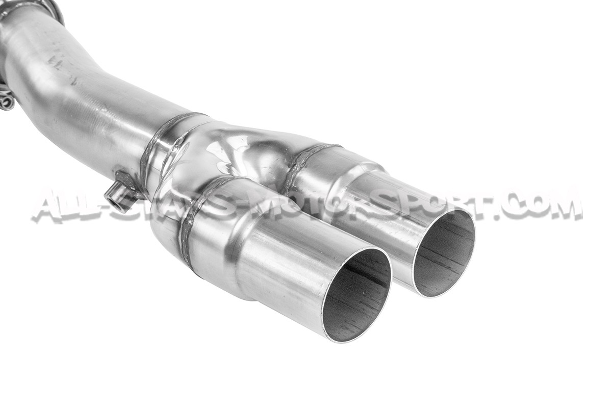 This Scorpion decat downpipe made from 4" / 100mm T304 grade stainless steel, mandrel bent and TIG welded pipework fits without modifications from the turbo to the original or aftermarket catback of the Audi RS3 8V5 / 8Y and TTRS Mk3 8S, to remove the OEM catalyst and OPF / GPF.