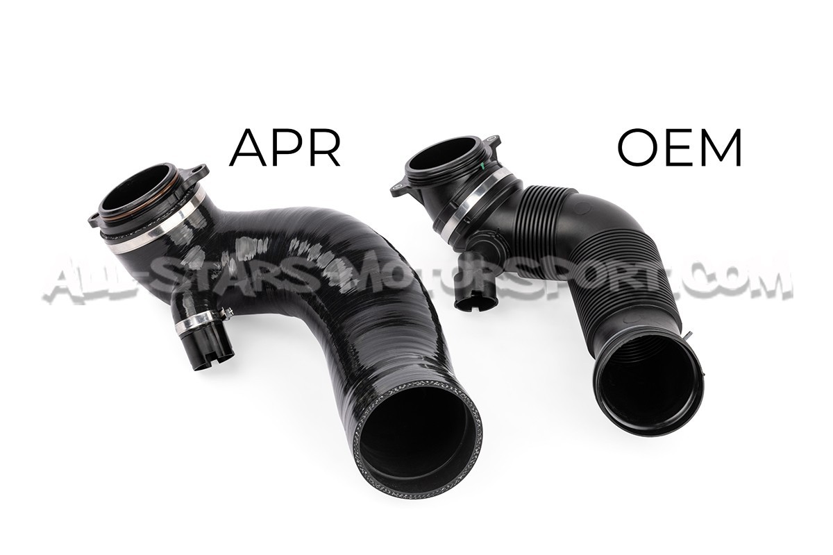 This APR turbo inlet kit consists of a composite turbo inlet adapter, a large volume silicone inlet hose and the mounting hardware require for direct installation between the turbocharger and the airbox of the 2.0 TFSI EA888.4 engines, equipping among others the Audi S3 8Y / Golf 8 R / Cupra Formentor. Featuring a very discreet black finish and a volume 30% larger than OEM, this combo will provide the perfect air flow to any setup, using both the stock air box or a performance intake.