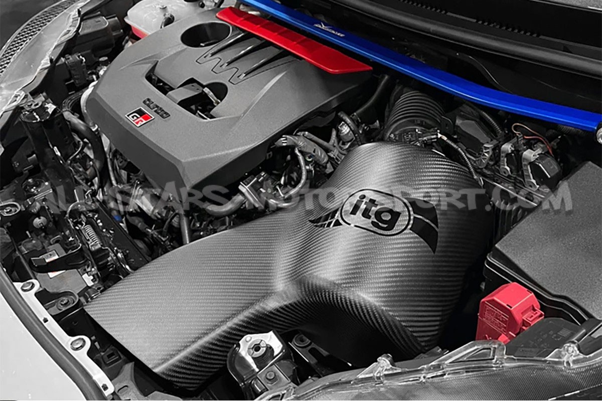 Composed of a high-performance Tri-foam filter housed in an airbox with integrated air diffuser and a large-volume intake tube, all made from matte-finish carbon fiber, this ITG Maxogen intake fits without any modification on the Toyota Yaris GR Gen.2. Designed to delivers increased power and torque, this intake system will also provide the G16E-GTS engine a more aggressive sound.