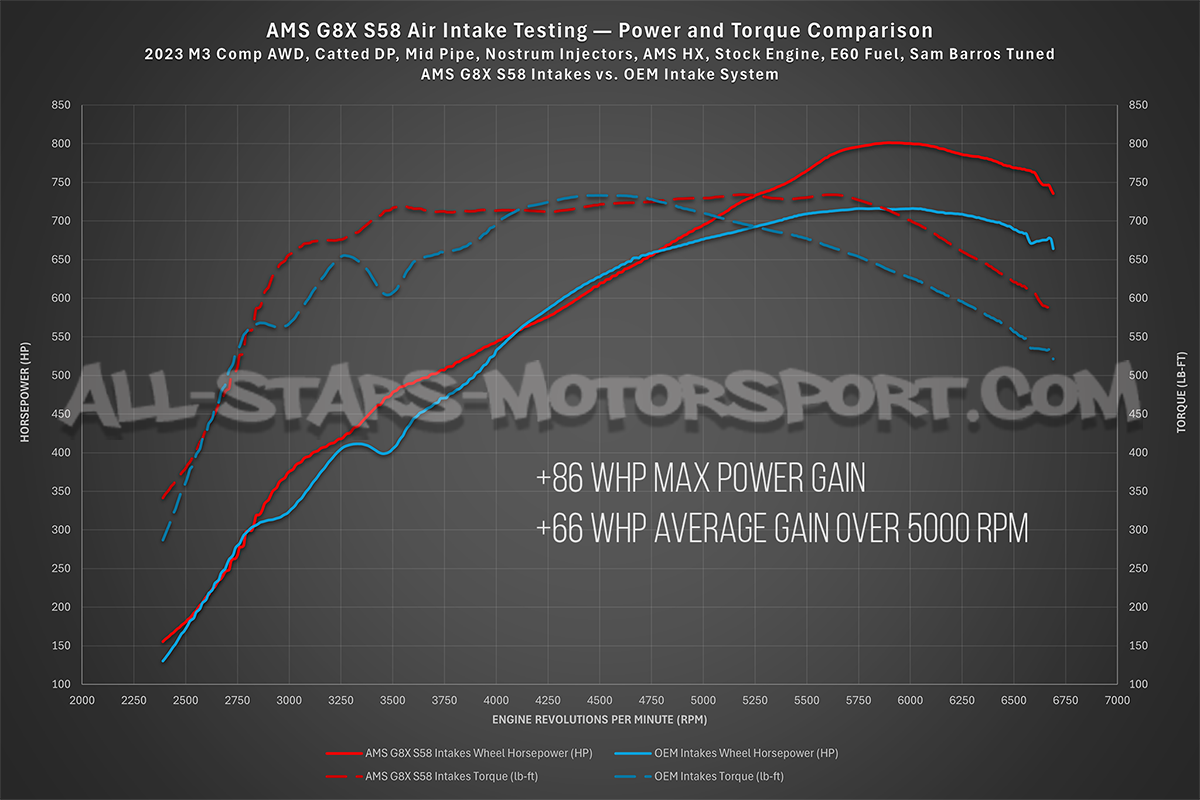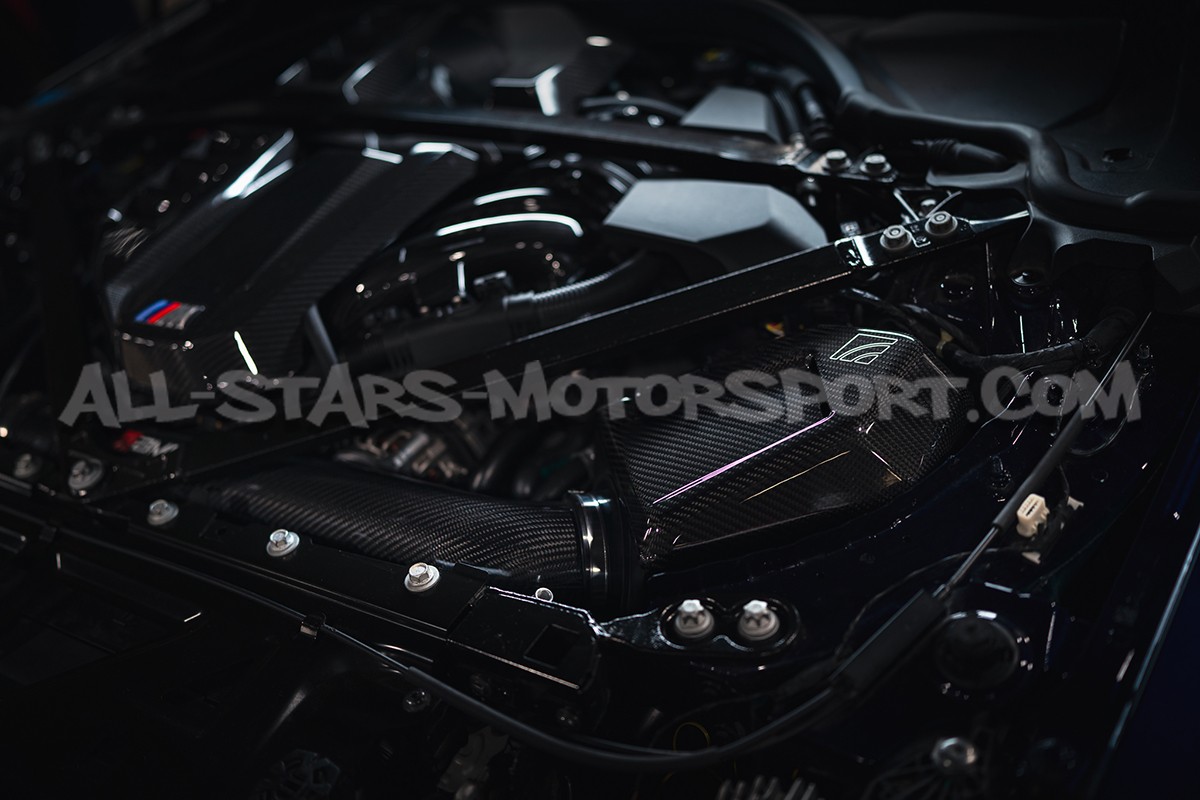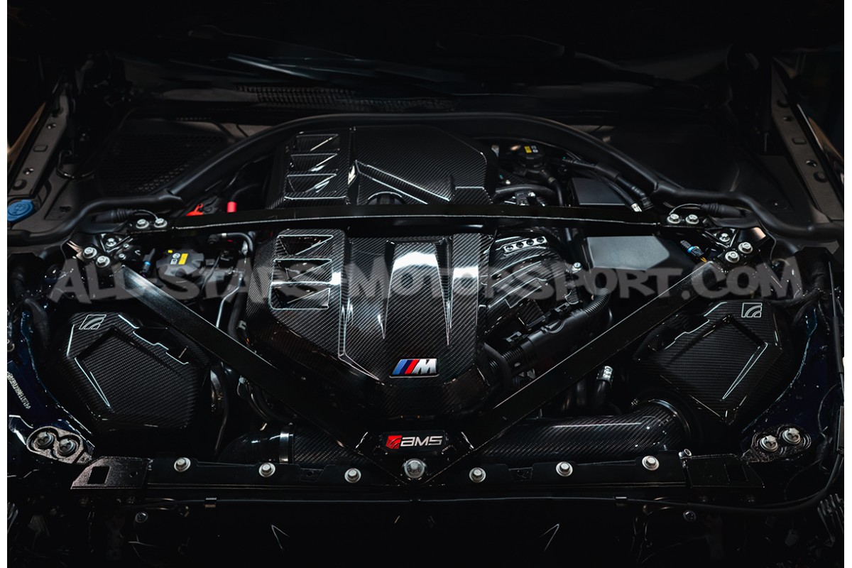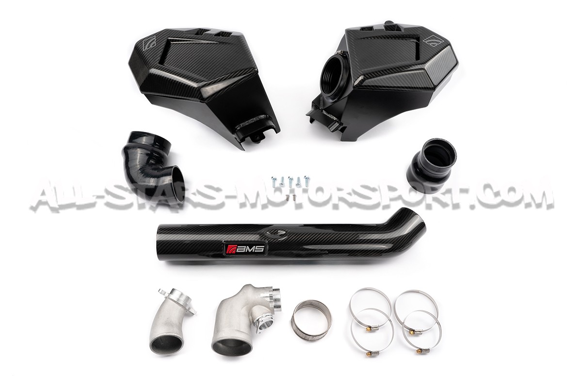 This AMS Performance intake, made from glossy-finish carbon fiber for the S58 engines of the BMW M3 G80, M4 G8x and M2 G87, is as impressive as it is effective! Delivering 48% more airflow than the stock system, this intake features two high-capacity air filters, two carbon-fiber airboxes, two 3.5" / 90mm carbon intake pipes, 128% larger turbo inlets and all the necessary hardware for a direct installation. With a measured maximum gain of 86hp on a stage 2+ tuned engine, this intake is undoubtedly one of the most effective on the market for this engine.