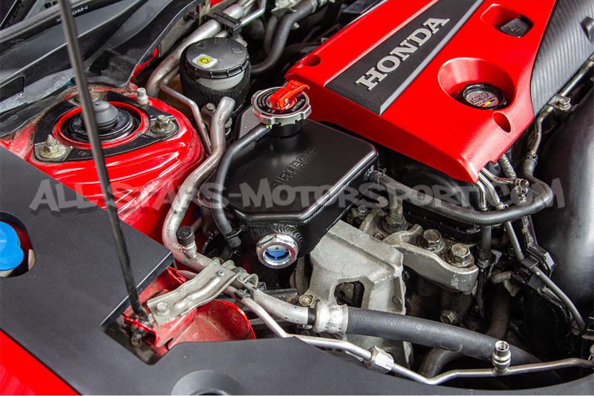 Made from aluminium with a satin black finish, this Airtec expansion tank fits without modification to replace the original plastic tank on the K20C1 engines of the Honda Civic Type R FK8. With a coolant level control point placed on the front part and a specific cap, this tank will bring an elegant touch to the engine bay while optimising the reliability of the cooling system.