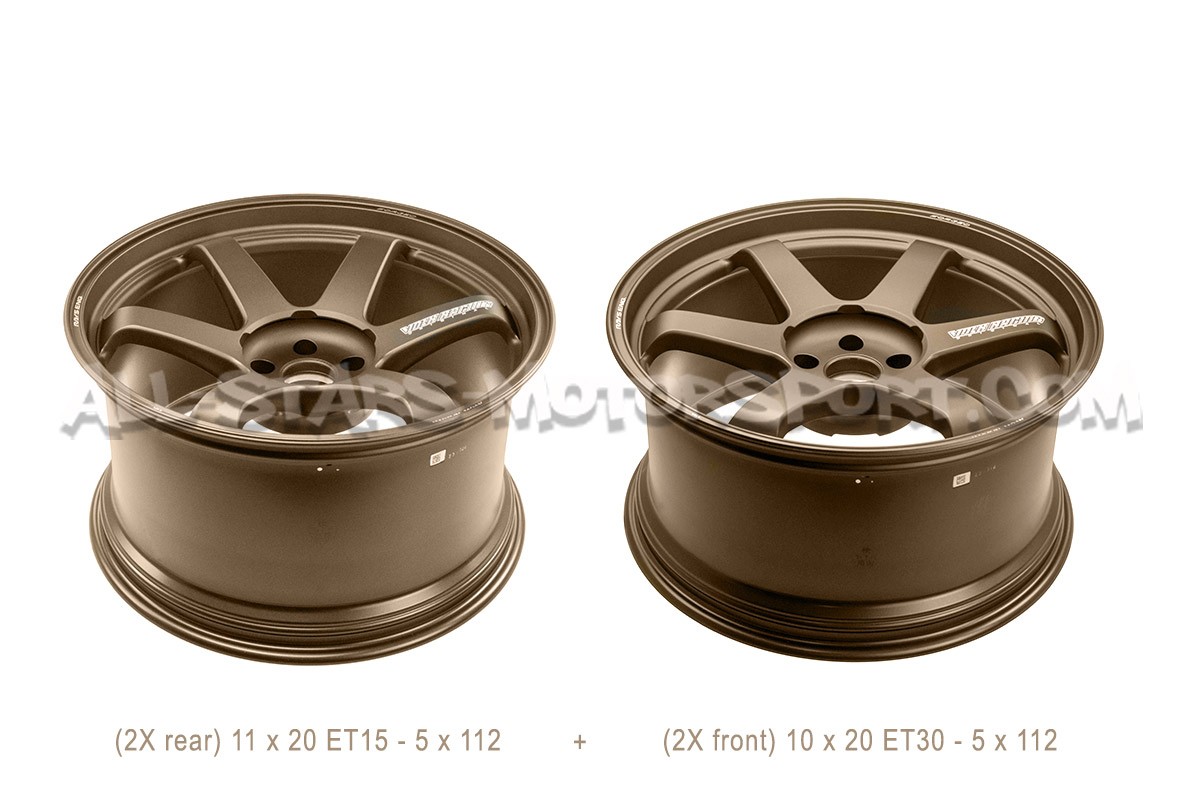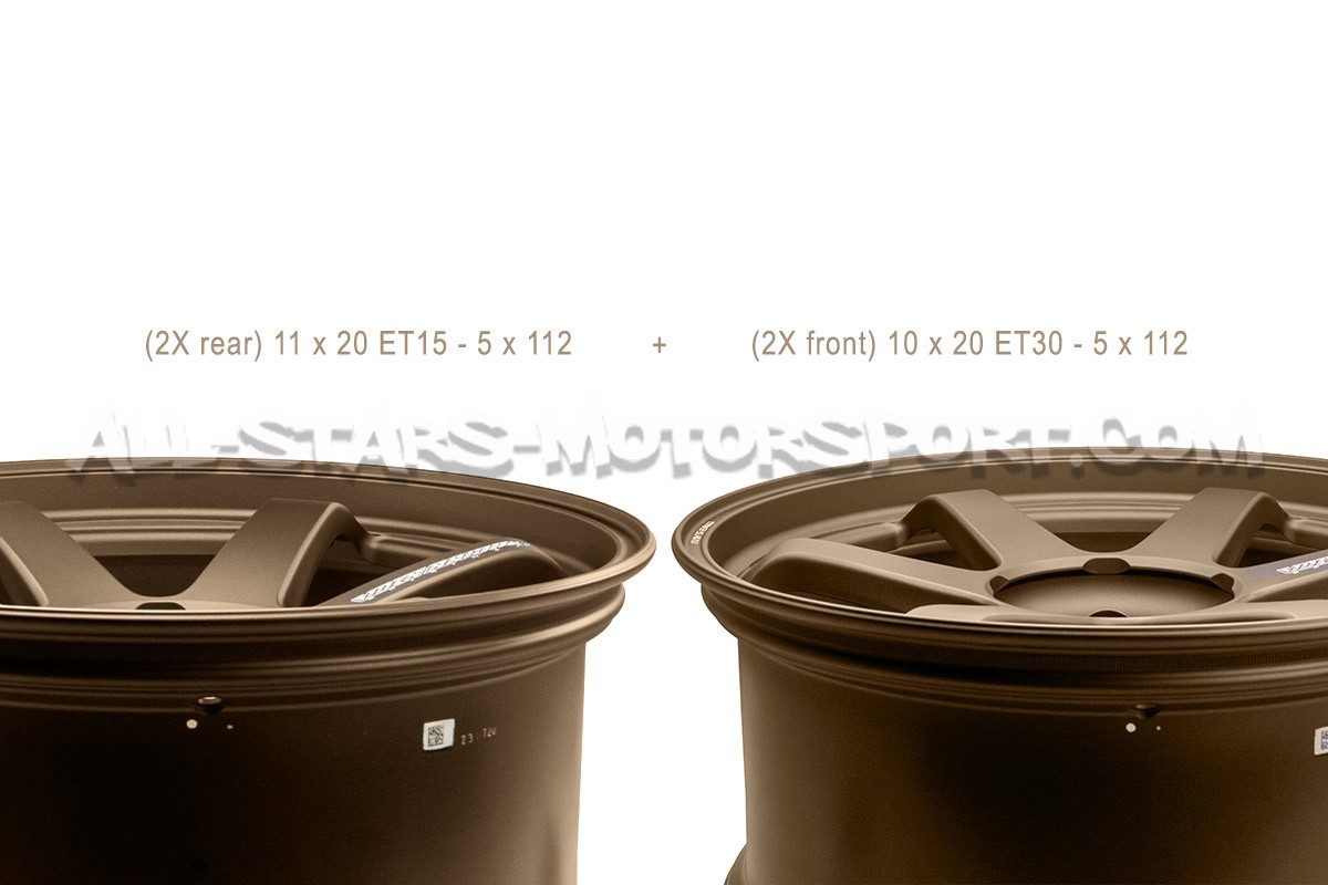 Forged from solid and ultra-lightweight aluminum, the Volk Racing TE37 Ultra Track Edition II wheels are among the lightest on the market thanks to the quality of materials and manufacturing process. Presented here in 10 x 20 ET15 (Front) and 11 x 20 ET15 (Rear) with a 5 x 112 bolt pattern, this limited edition of the legendary TE37 features an exclusive Blast Bronze finish and ideal sizes for aggressive fitment on the rear axle of the BMW M3 G80 / M4 G82 / M2 G87.