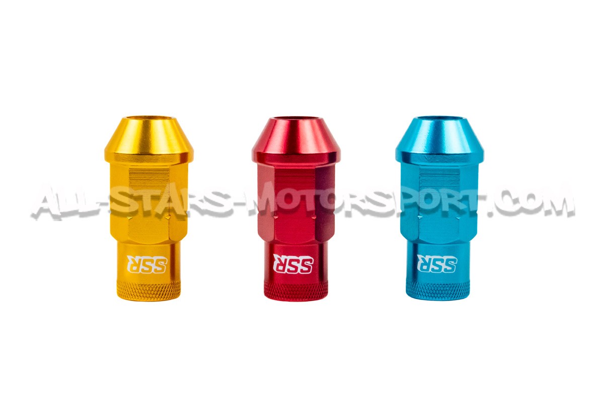 Fabricado en aluminio de alta calidad, este kit de 20 tuercas abiertas SSR Wheels está disponible en rojo, azul o amarillo y con rosca 12x150 o 12x125 a elegir según el tipo de vehículo. Suministrado con 16 tuercas HEX 19 y 4 tuercas antirrobo (llave de desbloqueo incluida), este kit tiene una longitud de 50 mm y asientos cónicos para una adaptación perfecta a la mayoría de las llantas del mercado. Diseñadas para uso en competicion, estas tuercas ultraligeras son extremadamente confiables y resistentes a diferencia de la mayoría de las tuercas de aleación convencionales que no soportan adecuadamente el calor y la fricción...