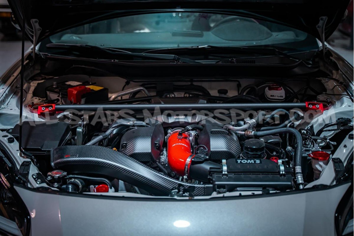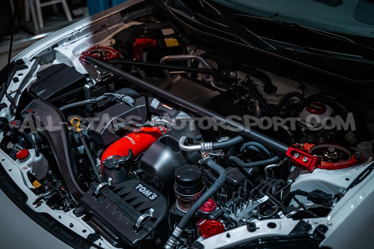 Verdadera obra de arte, esta barra de torretas superior delantera de Apexi está hecha de fibra de carbono con acabado mate y aluminio anodizado en rojo. Instalada sin modificaciones en los motores FA24 de los Toyota GR86 y Subaru BRZ ZD8, esta barra proporcionará mas rigidez al chasis y un aspecto único al compartimento del motor.