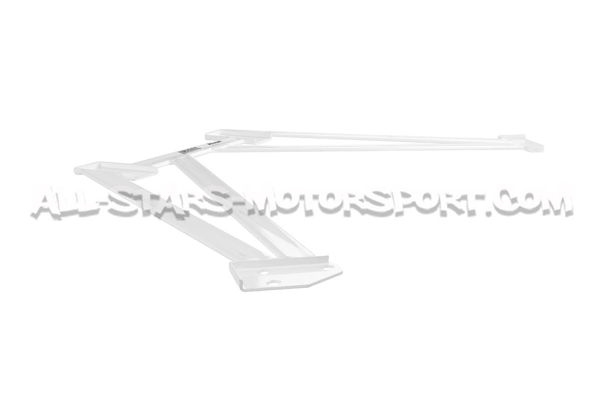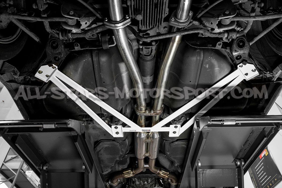 Instalada sin ninguna modificación para reforzar el eje trasero de los Nissan 350Z, esta barra de refuerzo inferior trasera de 4 puntos Ultra Racing esta compuesta por una estructura de acero de alta densidad que permite resistir presiones extremas y tiene un acabado blanco muy cualitativo