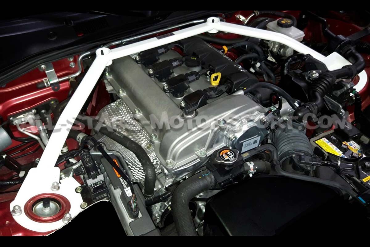 Instalada sin ninguna modificación para reforzar el eje delantero de los Mazda MX5 ND, esta barra de torreta superior delantera de 4 puntos Ultra Racing esta compuesta por una estructura de acero de alta densidad que permite resistir presiones extremas y tiene un acabado blanco muy cualitativo que incrementa el aspecto deportivo del motor.
