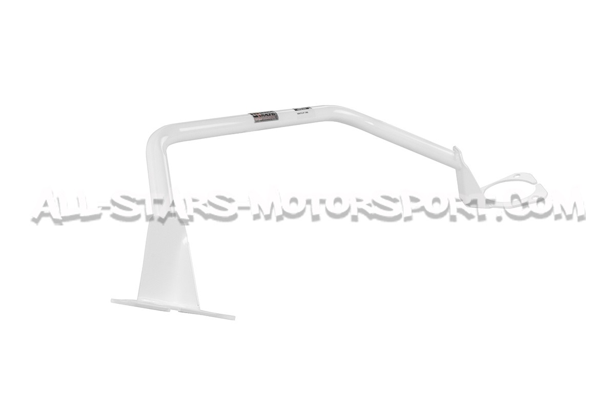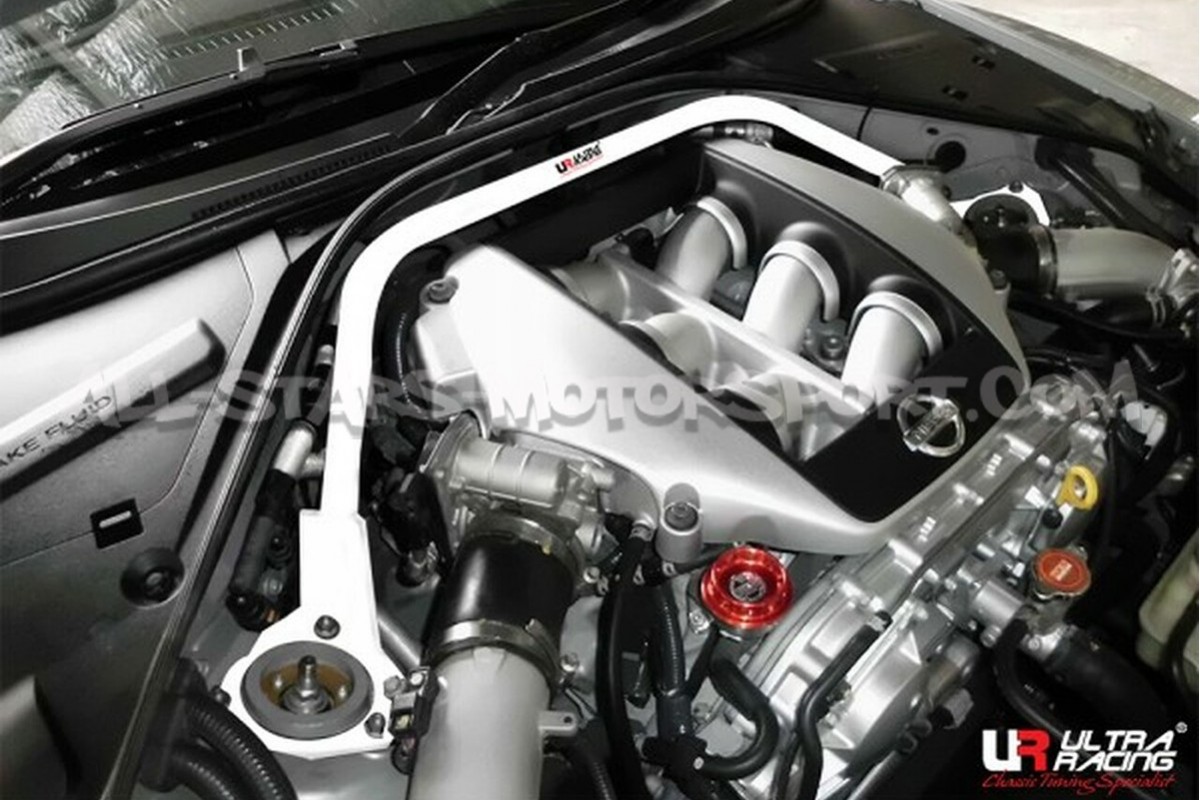 Instalada sin ninguna modificación para reforzar el eje delantero de los Nissan R35 GTR, esta barra de torreta superior delantera de 2 puntos Ultra Racing esta compuesta por una estructura de acero de alta densidad que permite resistir presiones extremas y tiene un acabado blanco muy cualitativo que incrementa el aspecto deportivo del motor.