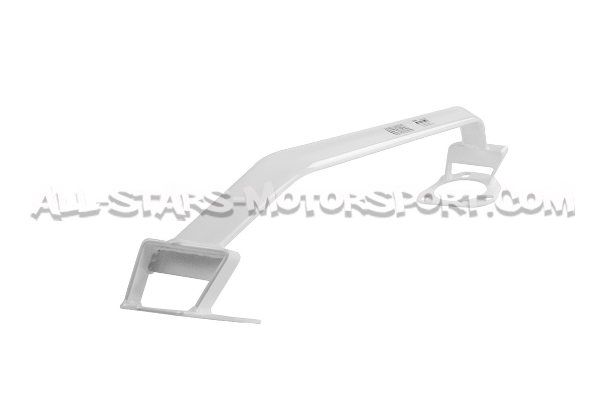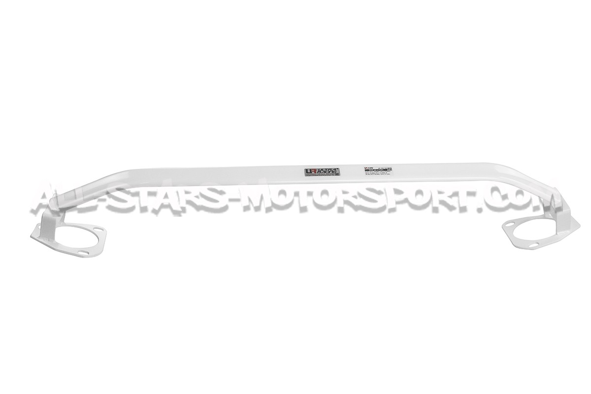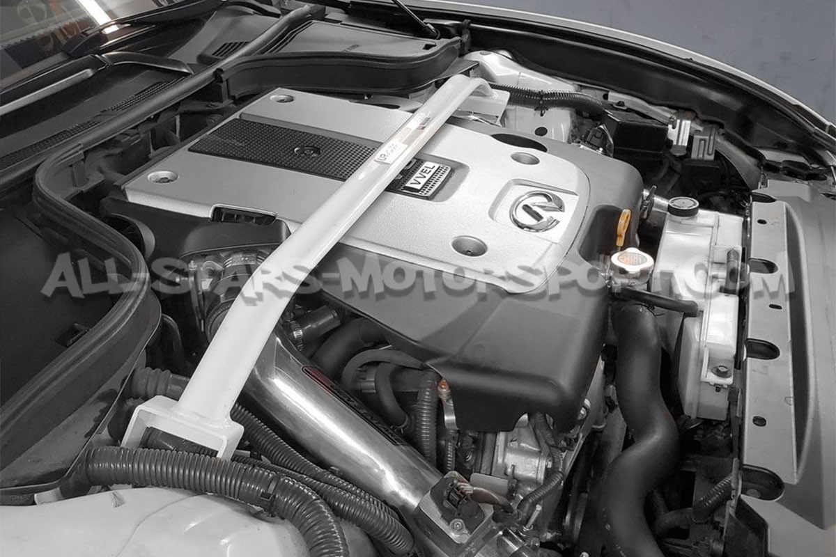 Instalada sin ninguna modificación para reforzar el eje delantero de los Nissan 370Z, esta barra de torreta superior delantera de 2 puntos Ultra Racing esta compuesta por una estructura de acero de alta densidad que permite resistir presiones extremas y tiene un acabado blanco muy cualitativo que incrementa el aspecto deportivo del motor.
