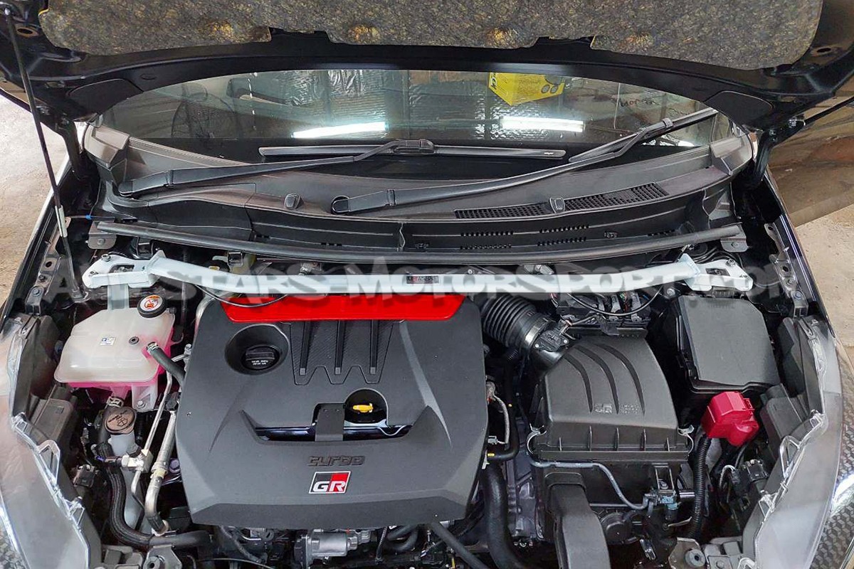 Instalada sin ninguna modificación para reforzar el eje delantero de los Toyota Yaris GR Gen.1, esta barra de torreta superior delantera de 2 puntos Ultra Racing esta compuesta por una estructura de acero de alta densidad que permite resistir presiones extremas y tiene un acabado blanco muy cualitativo que incrementa el aspecto deportivo del motor.