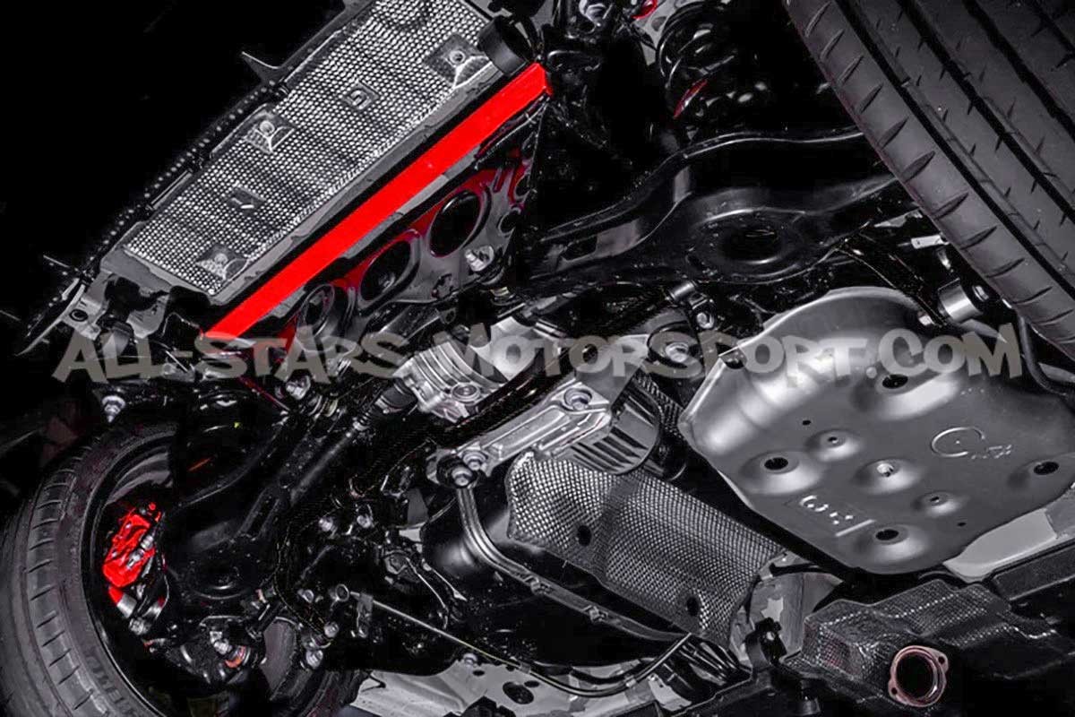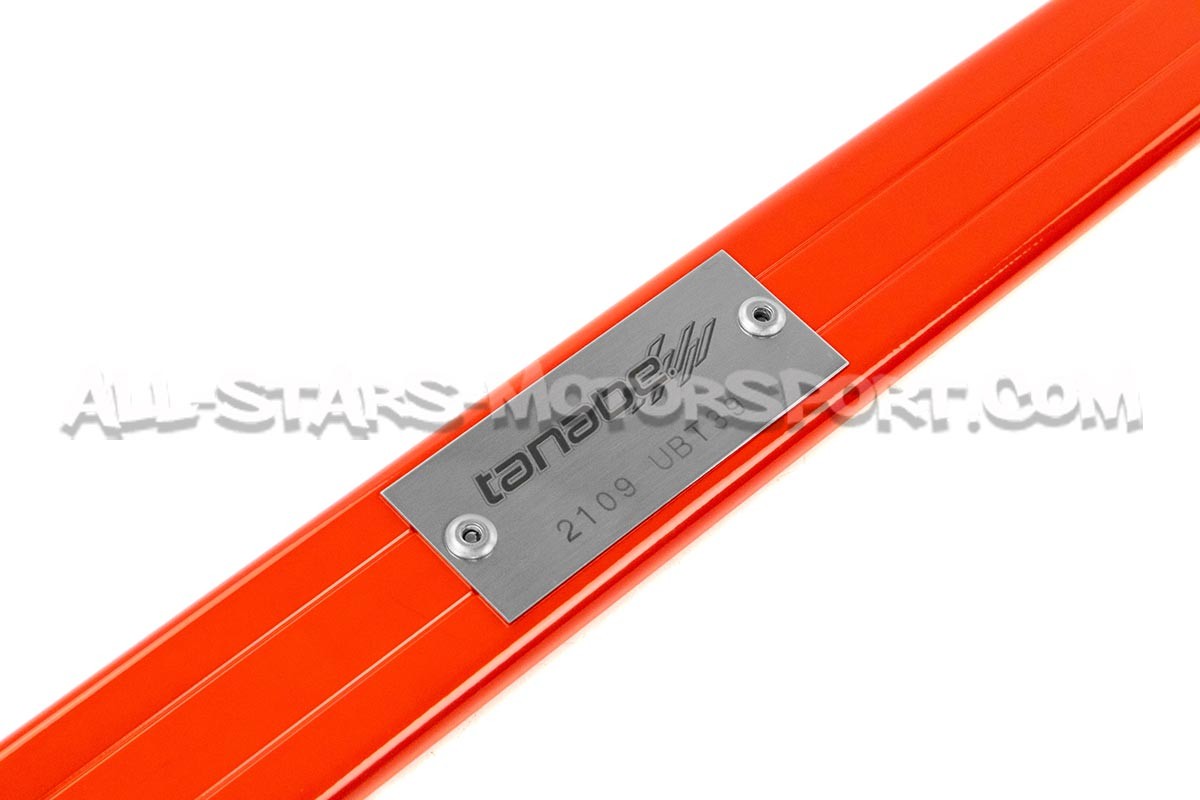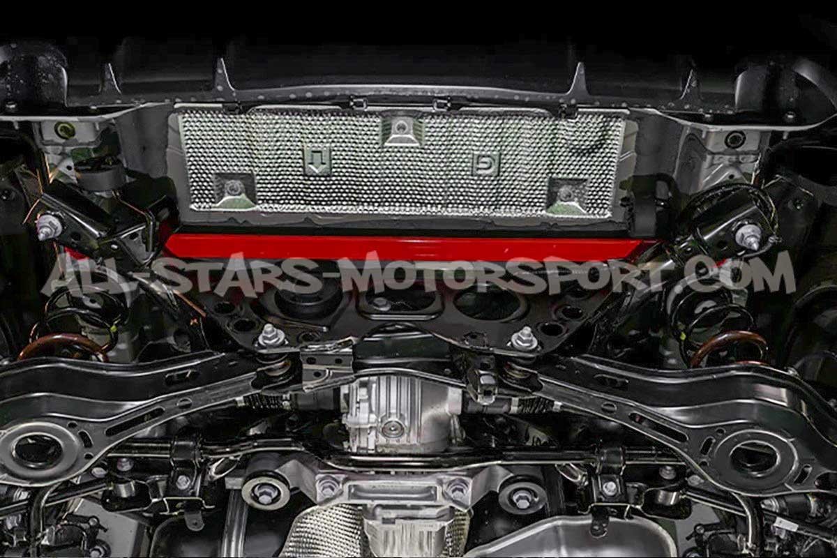 Esta barra de refuerzo inferior trasera de 2 puntos Tanabe Sustec, fabricada en aluminio de alta calidad, se instala sin modificaciones en los Toyota Yaris GR Gen.1 para proporcionar una mayor rigidez al eje trasero durante sesiones de conducción agresiva tanto en carretera como en pista.