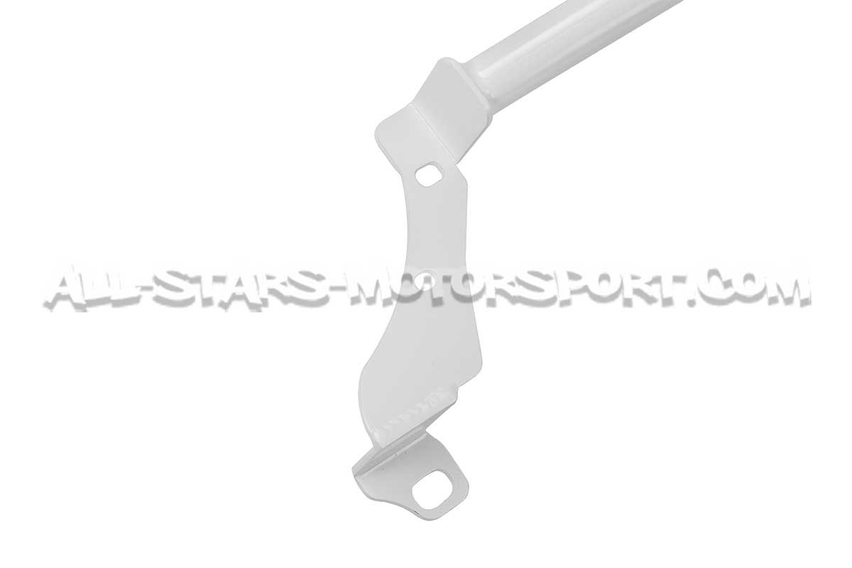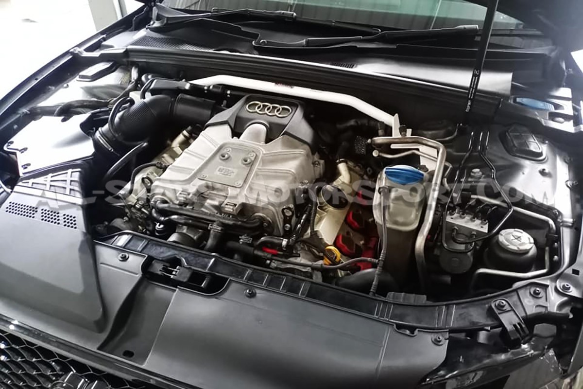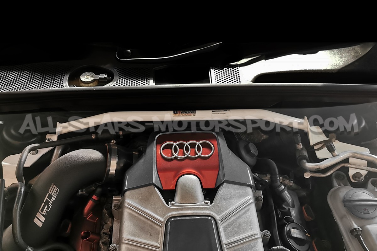 Instalada sin ninguna modificación para reforzar el eje delantero de los Audi S5 8T, esta barra de torreta superior delantera de 2 puntos Ultra Racing esta compuesta por una estructura de acero de alta densidad que permite resistir presiones extremas y tiene un acabado blanco muy cualitativo que incrementa el aspecto deportivo del motor.