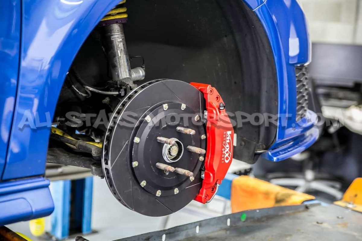 Este kit de frenos delanteros V-MAXX para BMW 135i / 235i / 140i / 240i F2x lleva pinzas de aluminio rojo de 6 pistones, discos flotantes de 2 piezas, rayados y ventilados de 365mm, latiguillos metalicos, pastillas street / sport y el kit de montaje completo para una instalacion directa sin modificacion.