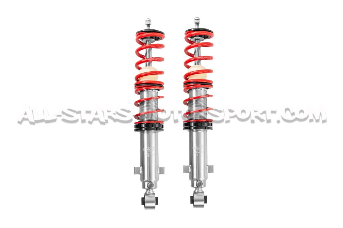 Este kit de suspensión roscada V-MAXX disponible en versión X-Street o X-Sport, destinado a los Mazda MX5 NB, constituye una de las mejores relaciones calidad/precio del mercado para uso en carretera como en pista. Ofreciendo un ajuste preciso de la altura de manejo de -35mm a -65mm, este kit completo delantero/trasero con homologacion TUV se instala sin modificaciones para proporcionar un comportamiento más deportivo al vehículo pero también para mejorar considerablemente su apariencia. ¡La versión X-Sport ofrece además del ajuste de altura, ajuste de dureza en 24 posiciones!