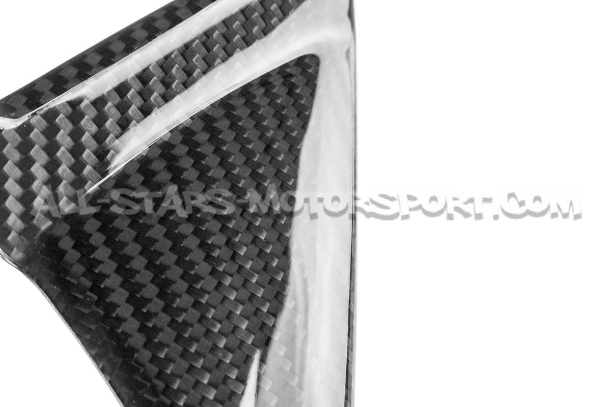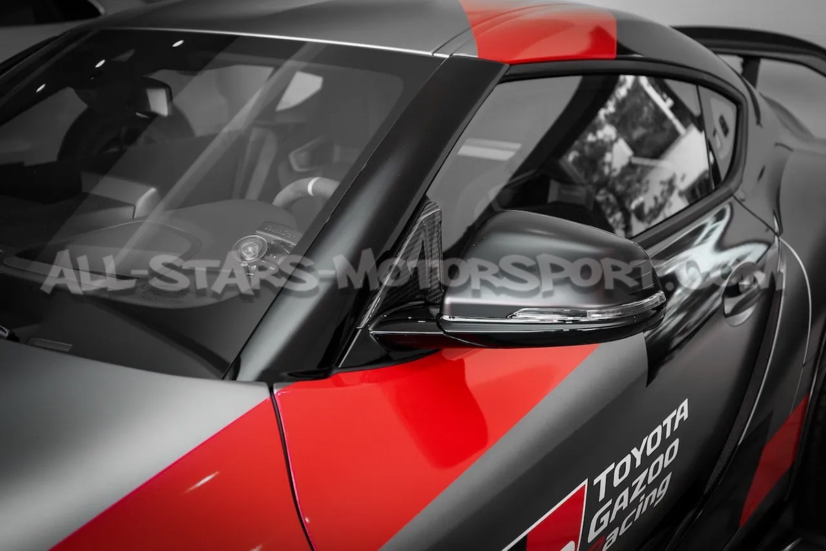 Fabricadas en fibra de carbono brillante, estas cubiertas para pilares de retrovisores Armaspeed se instalan sin modificaciones en las bases de serie de los Toyota Supra Mk5 A90 para mejorar su estética y su aerodinámica. La forma de estas placas optimiza el flujo de aire entre la puerta y el retrovisor, limitando las turbulencias dinámica a altas velocidad.