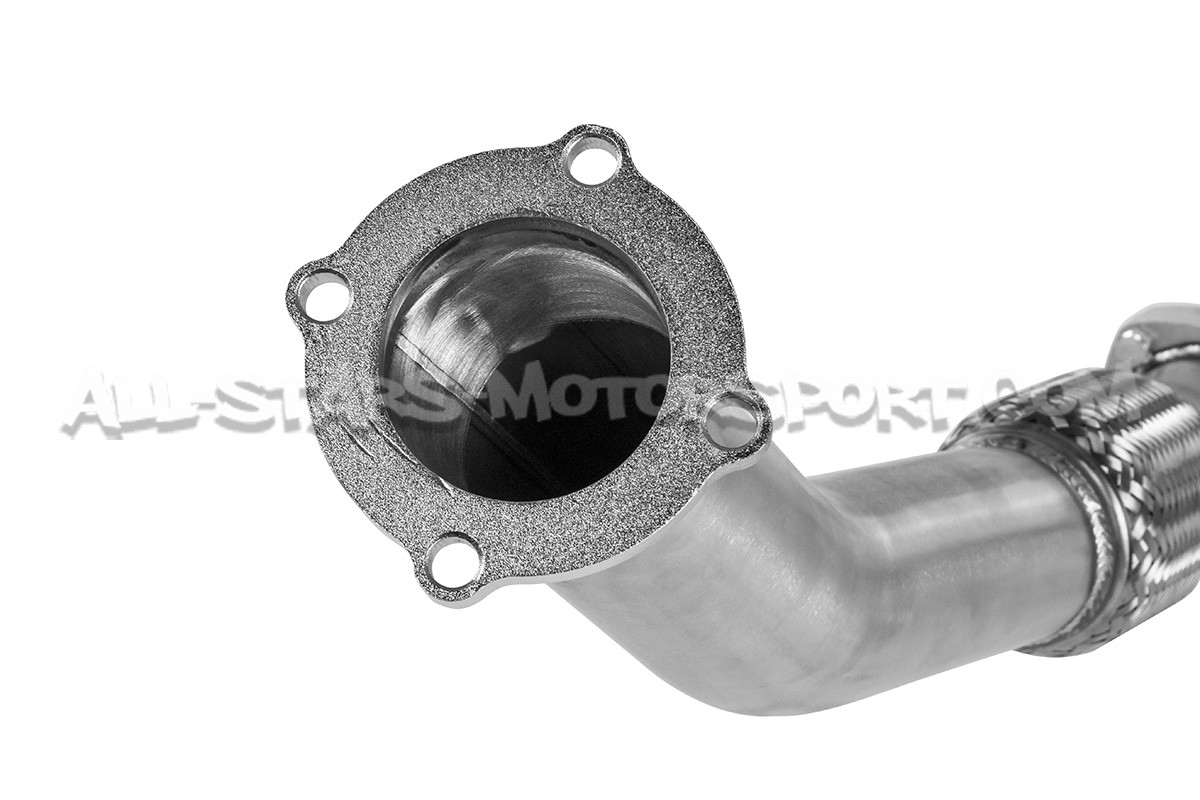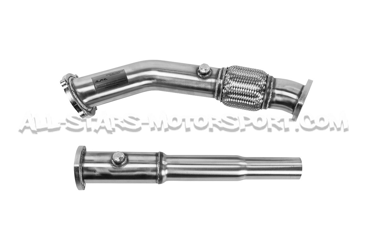 Downpipe con descatalizador Alpha Competition fabricada en acero inoxidable T304 con soldaduras TIG hechas a mano. Con tuberías de 3" / 76mm desde el turbo hasta el tubo central, esta downpipe de alta calidad se instala sin modificaciones en los Golf 4 GTI / León 1M y Audi TT 8N 1.8T 20V FWD
