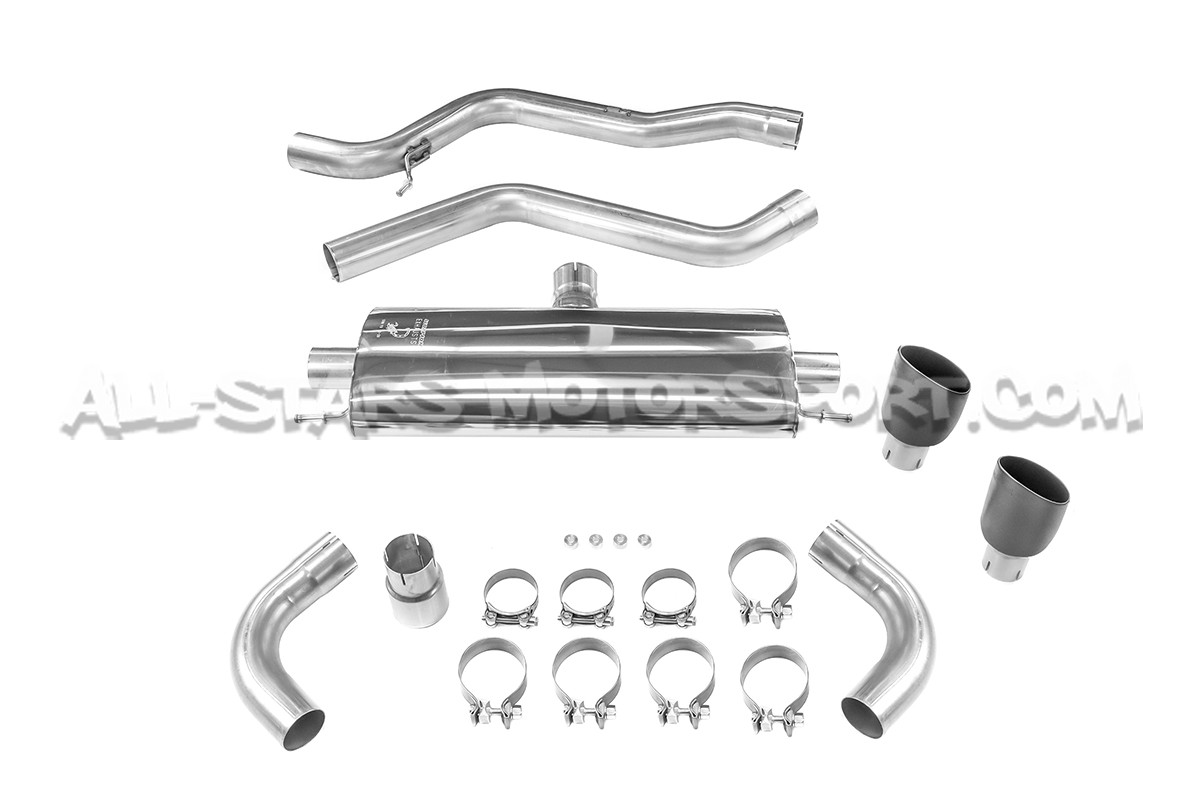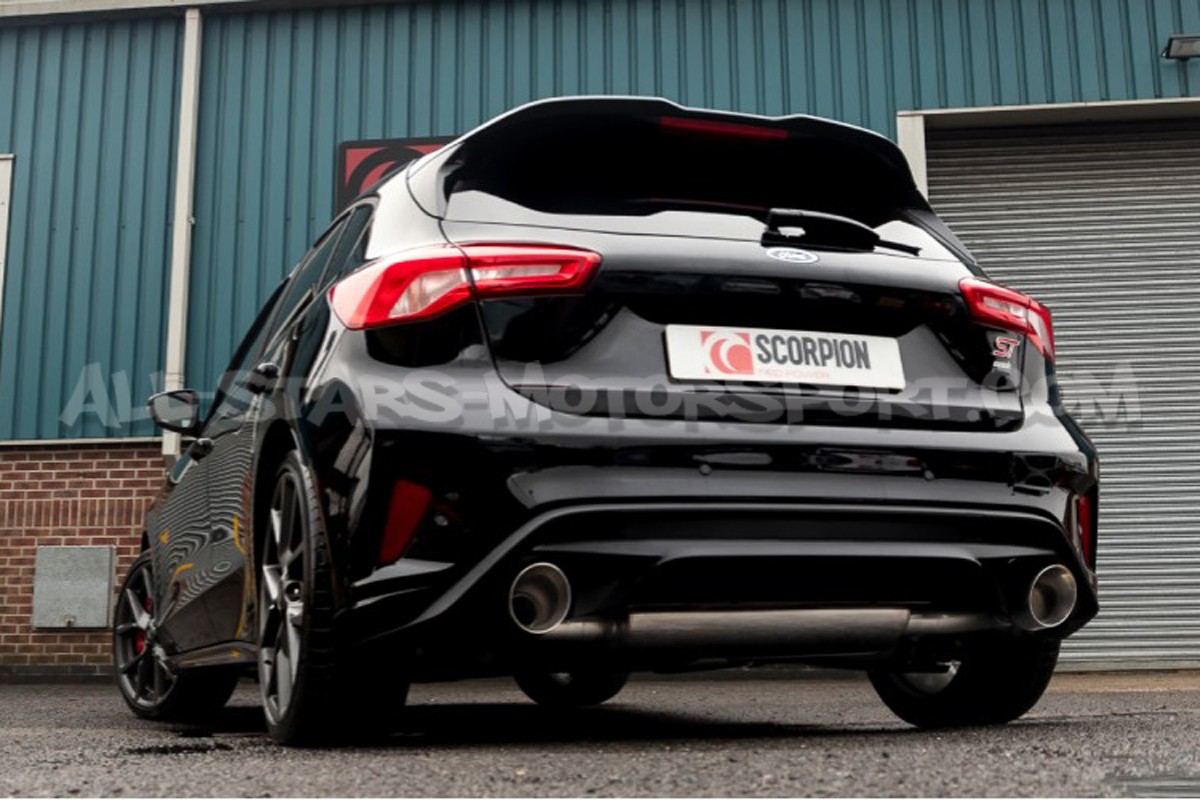 Escape catback Scorpion fabricado en acero inoxidable T304 con soldaduras MIG y tuberias de 3" / 76mm, desde el FAP original o deportivo. Este escape para Focus 4 ST 280 esta disponible con colas Daytona pulidas o negras de 114mm