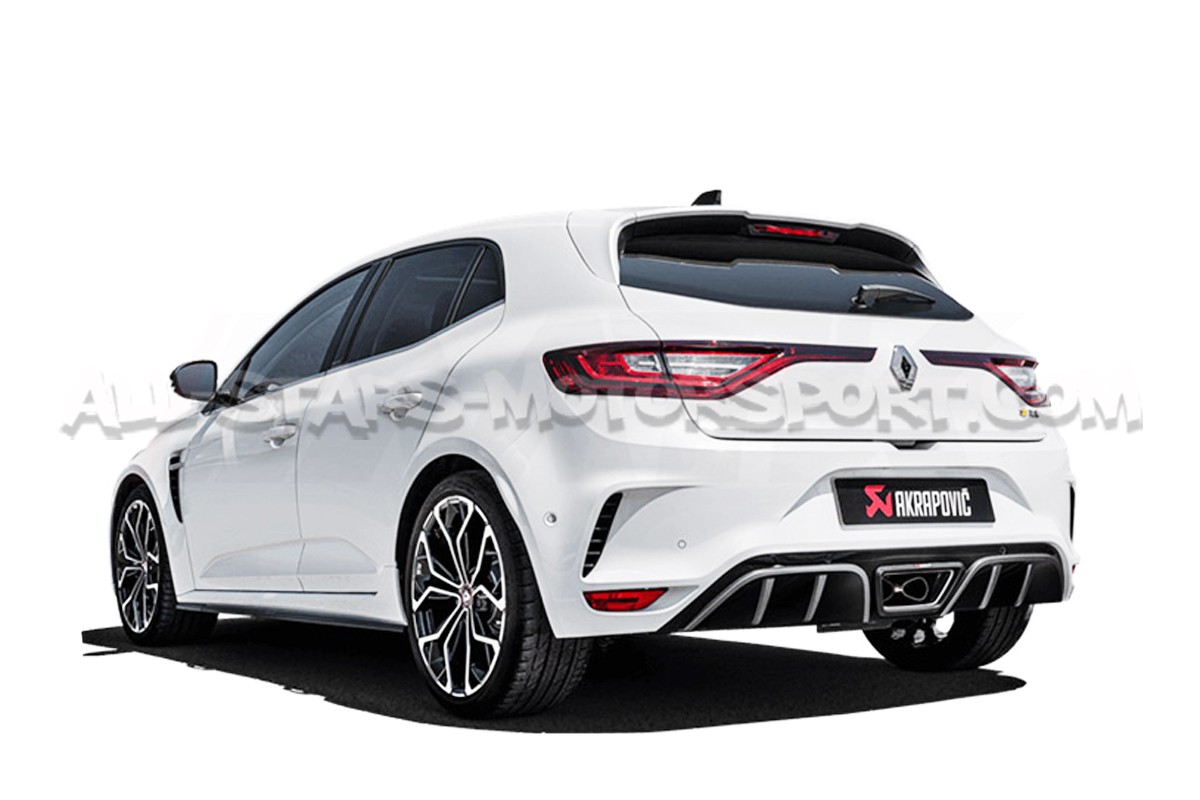 Este escape Akrapovic fabricado en titanio de alta calidad para los Renault Megane 4 RS lleva el tubo central y el silenciador trasero con una cola de escape de fibra carbono y el kit de montaje completo !