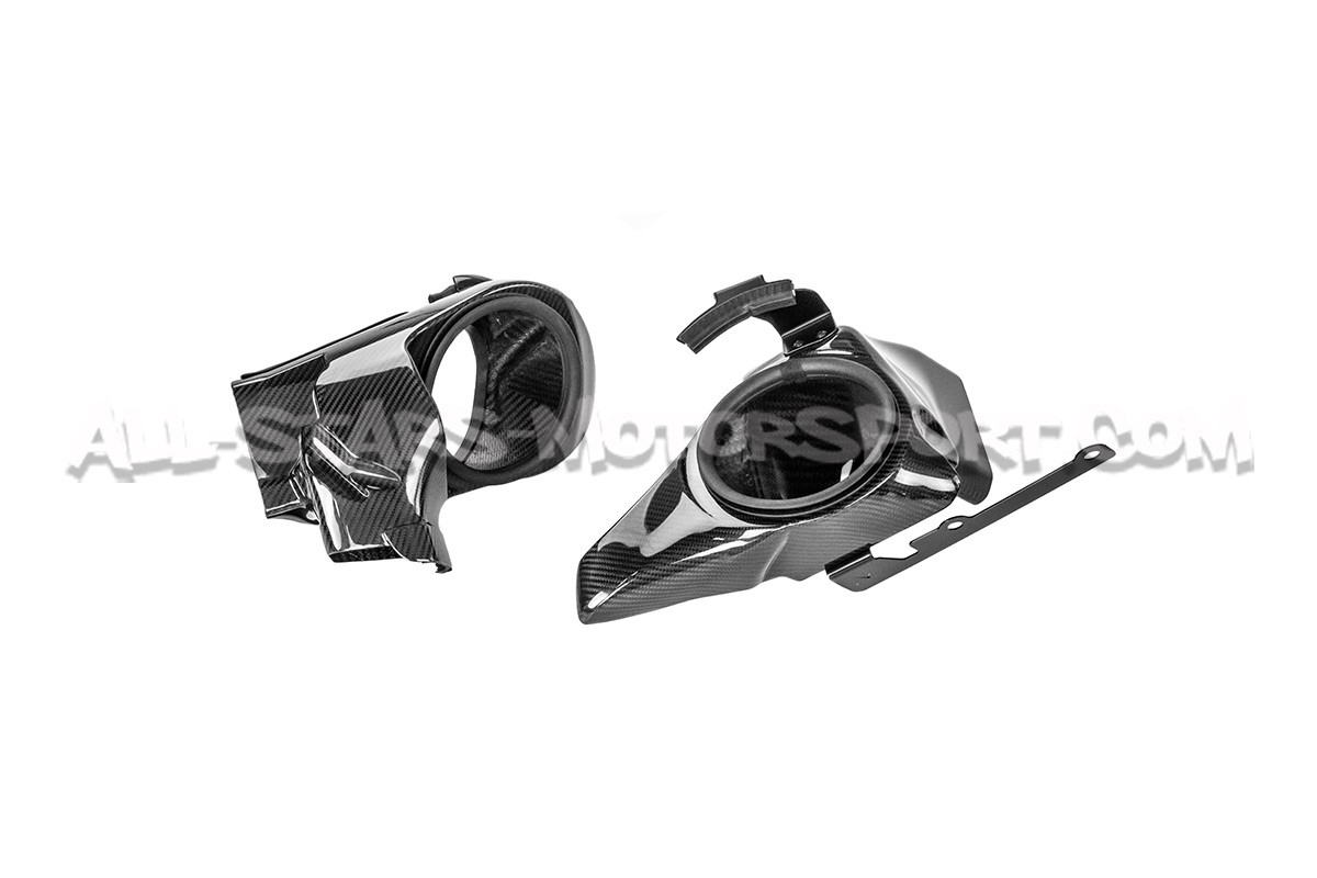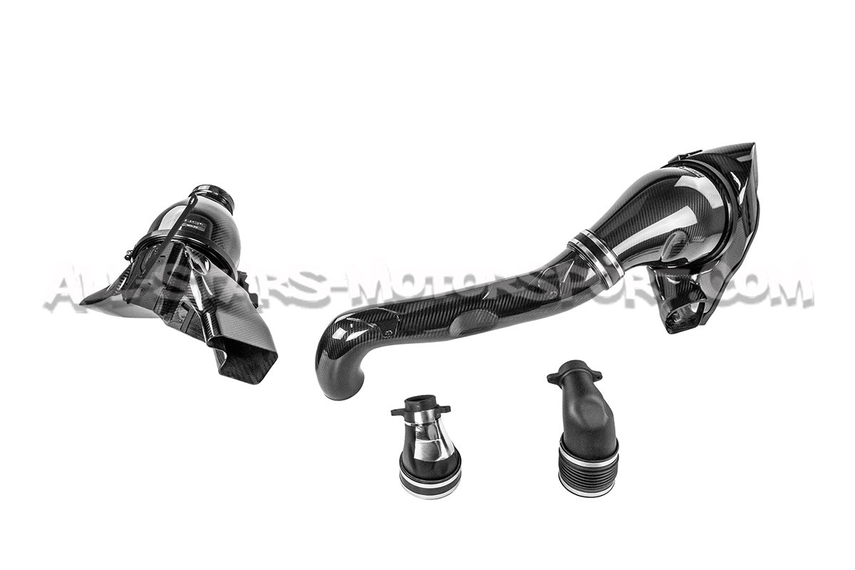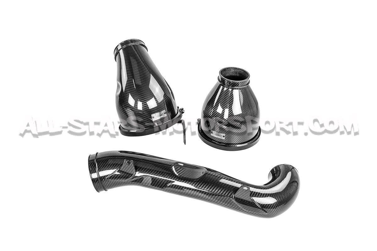 La admision dinamica de carbono Eventuri para los motores S58 de los BMW M3 G80 / M4 G8x y M2 G87 se compone de dos cajas de aire con filtro lavable y reutilizable, un tubo de admision, dos difusores de aire y del kit de montaje completo. Este kit totalmente sellado permite aumentar el flujo de aire y tambien bajar la temperatura de admision hasta permitir una ganancia de potencia significativa !