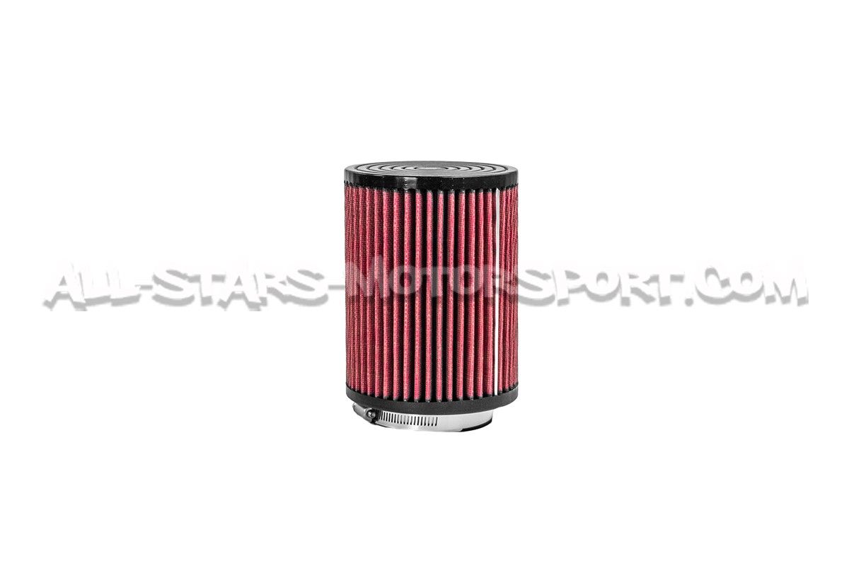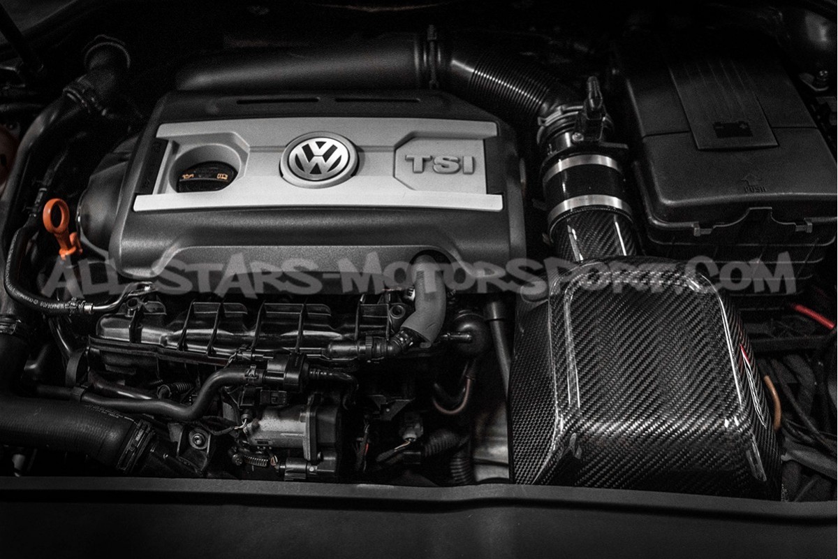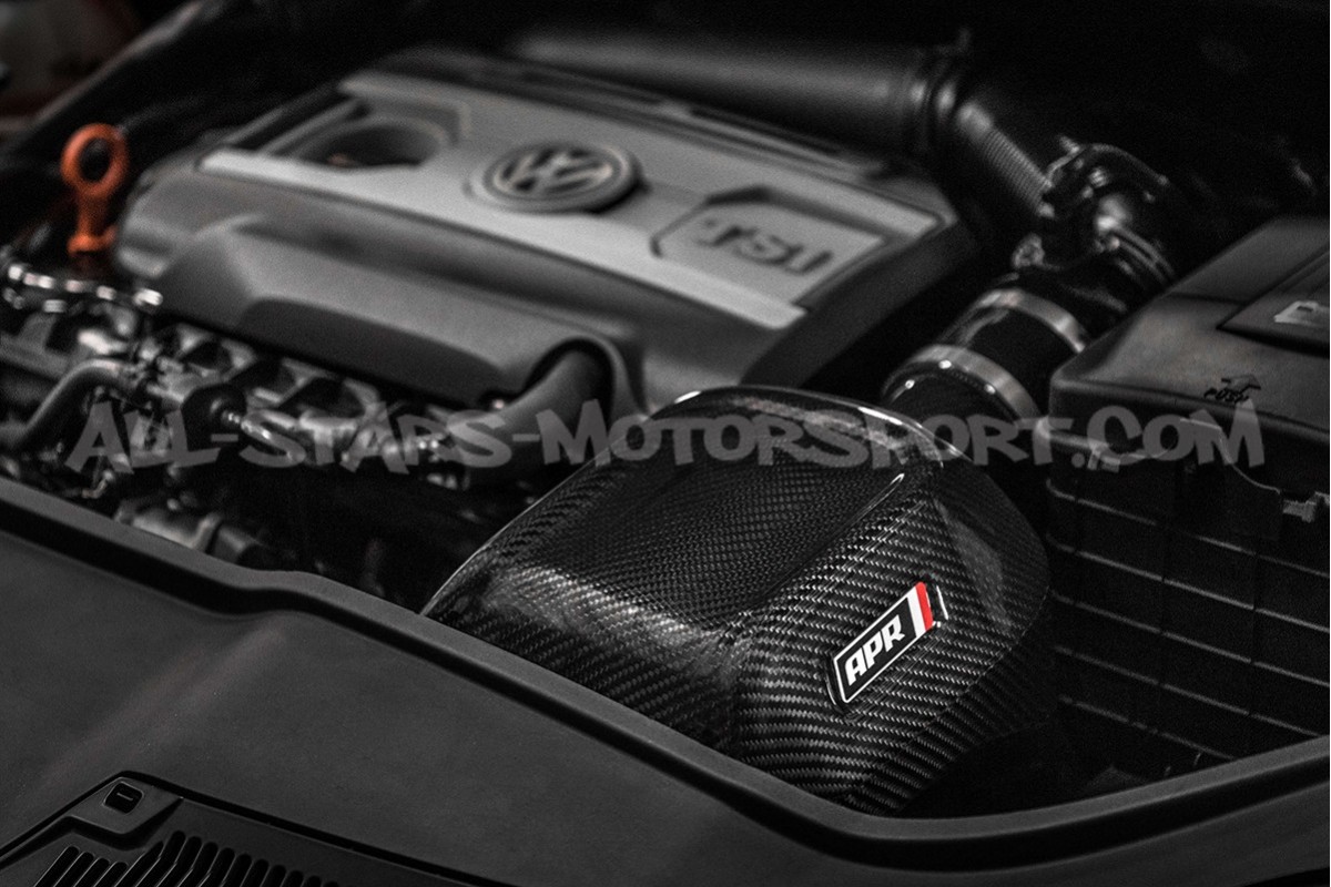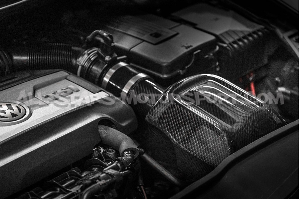 Esta admisión APR, fabricada en fibra de carbono, se instala desde el soporte del caudalímetro en los motores 2.0 TSI EA888 que equipan, entre otros, los Golf 6 GTI / León 2 FR / TT 8J o Scirocco. Con un 31% más de flujo de aire que el elemento estándar, esta caja de aire, equipada con un filtro de algodón lavable y reutilizable, se entrega con el manguito de silicona reforzada y el kit de montaje necesario para la instalacion.