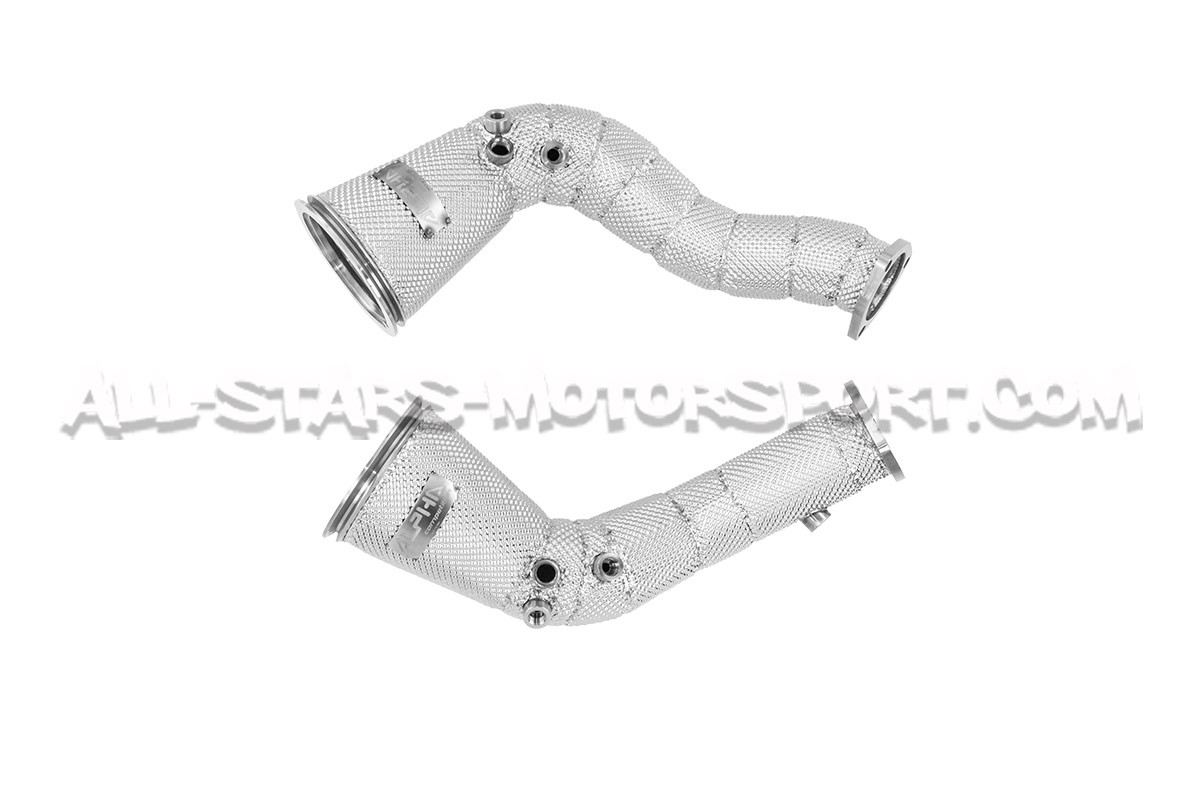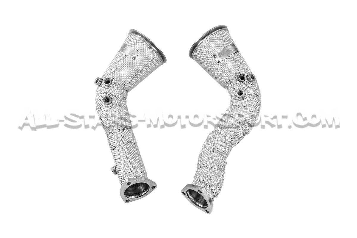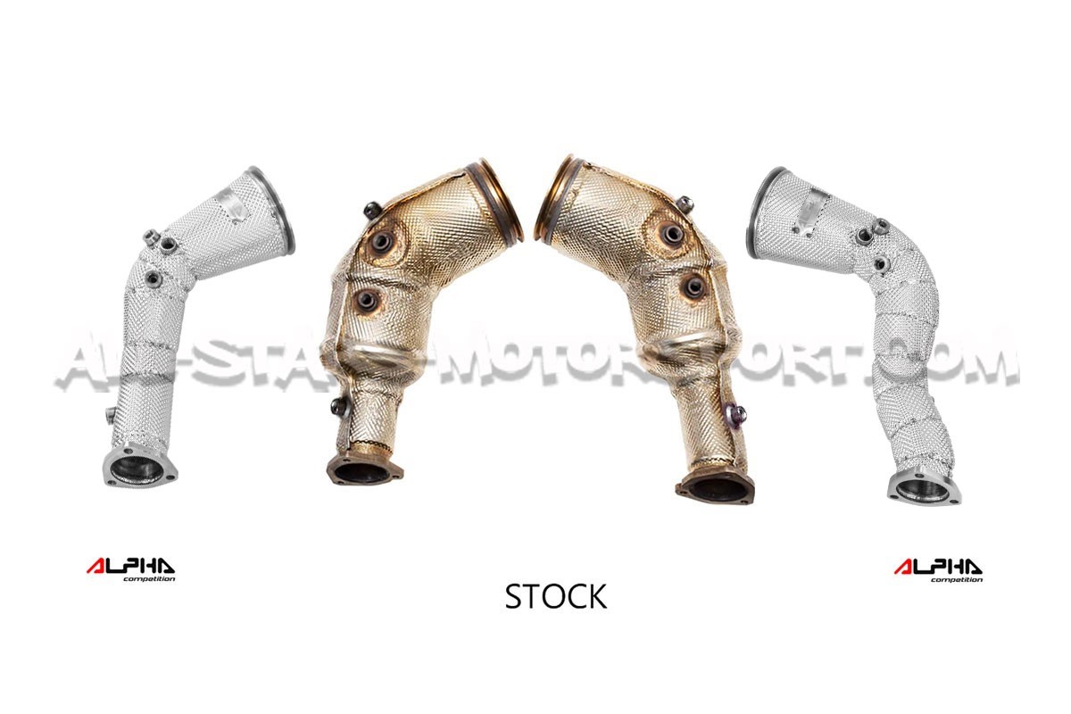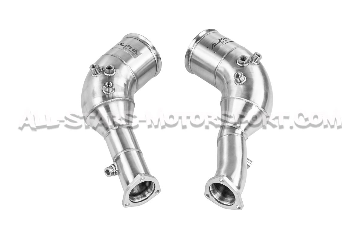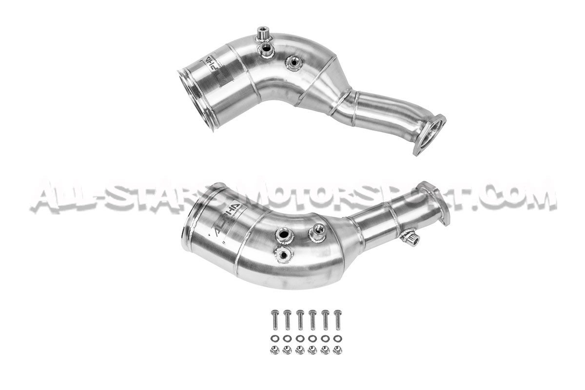 Estas downpipes descatalizadas Alpha Competition realizadas totalmente en acero inoxidable de diámetro 5" / 130 mm reducido a 3,15" / 80 mm se instalan sin modificaciones entre los turbos y los tubos delanteros de los motores 4.0 TFSI instalados en los Audi RS6 C8 y Audi RS7 C8 (con OPF). Fabricadas en acero inoxidable T304 de alta calidad con soldaduras TIG hechas a mano y con una estructura de alto flujo, ¡estas downpipes son claramente la mejor relación calidad-precio del mercado!