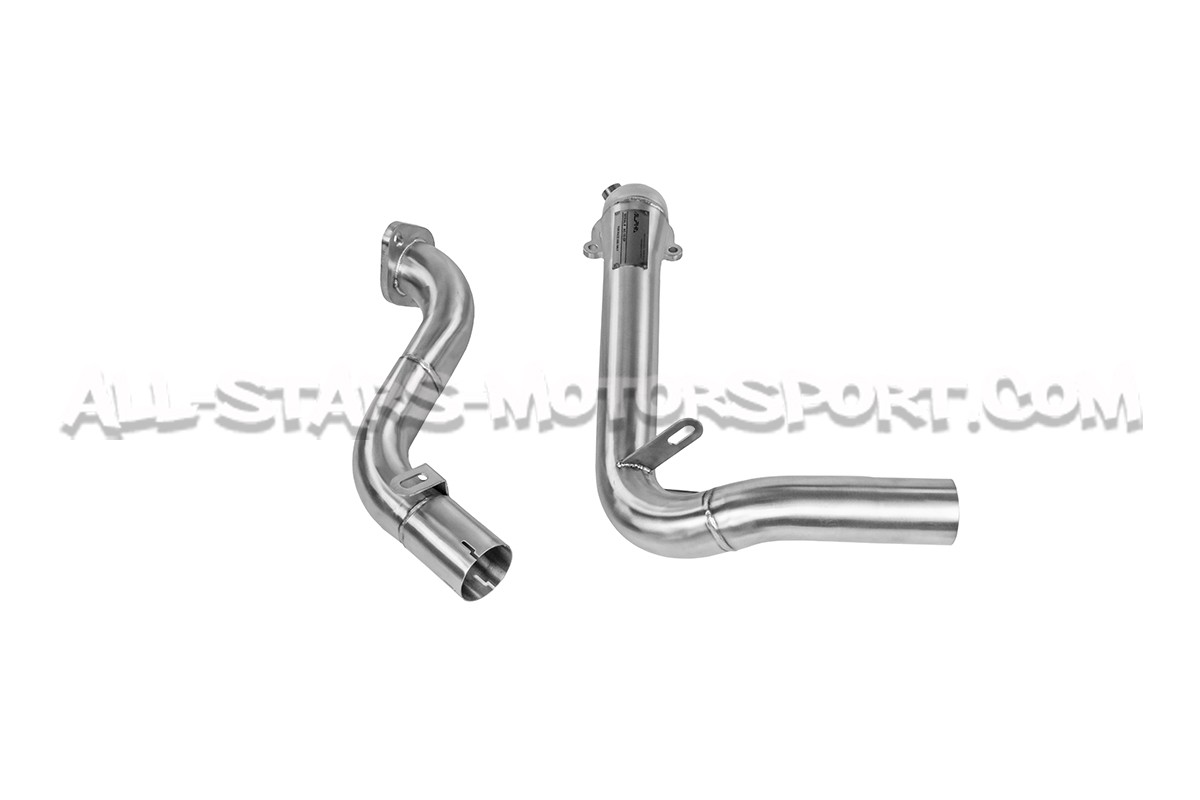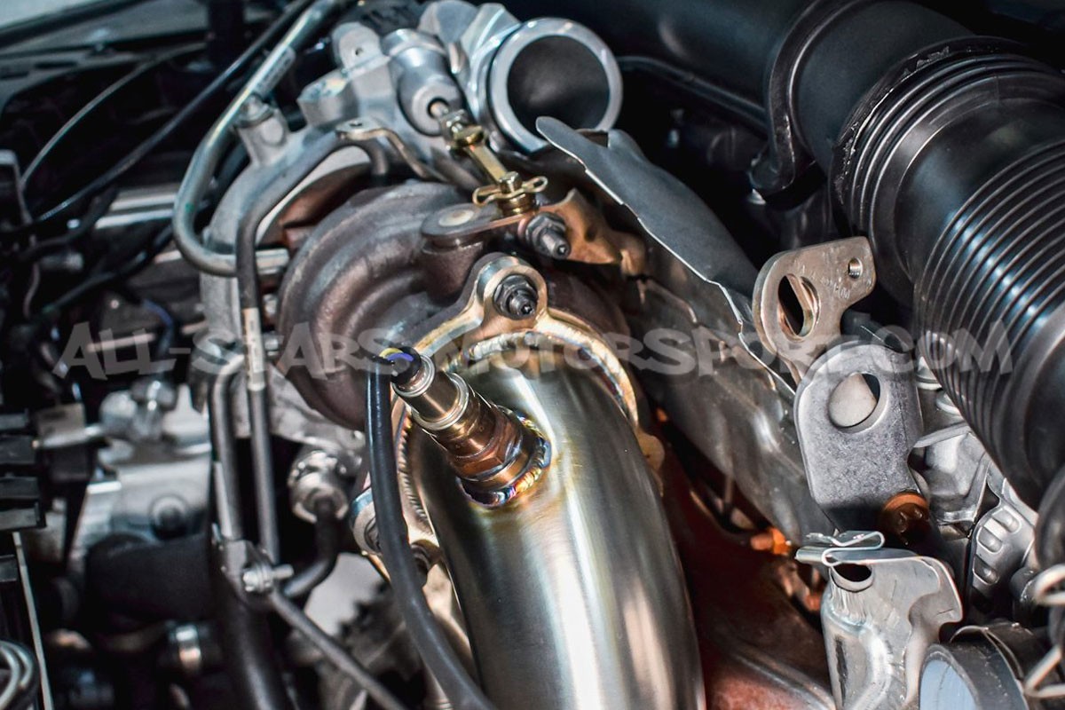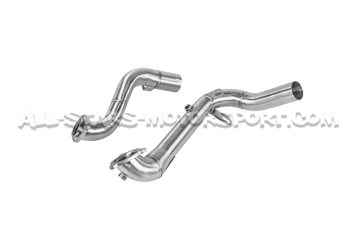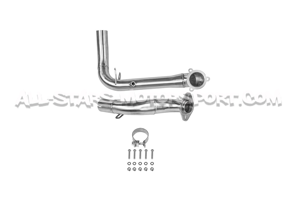 Fabricada en acero inoxidable T304 con soldaduras TIG, esta downpipe descatalizada Alpha Competition se coloca entre el turbo y el tubo delantero de los Mercedes Benz A35 AMG W177 para suprimir el catalizador principal. Con un sonido agresivo y una ganancia de 16 hp, esta downpipe de 3" / 76 mm en la salida del turbo y luego de 2,5" / 63,5mm es claramente la mejor relación calidad-precio del mercado con su diseño high flow y acabado excepcional.