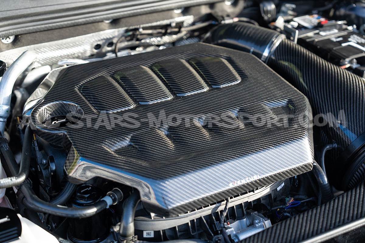 Esta tapa de motor Eventuri en fibra de carbono con acabado brillante se instala en reemplazo directo de la de serie para aportar un toque deportivo / elegante a los motores EA888.4 de los Golf 8 GTI y Golf 8 R ! Complemento estético perfecto para la admisión de la marca, la cubierta Eventuri dispone del mismo acabado que todos los productos de la gama