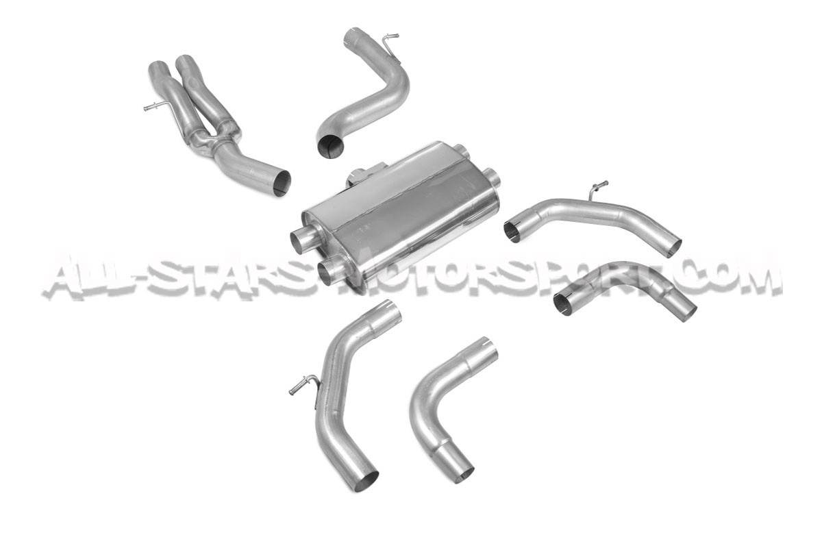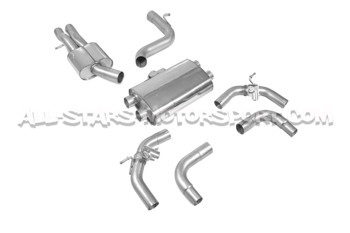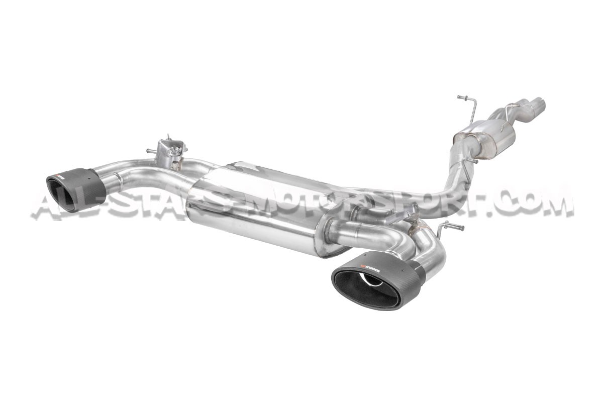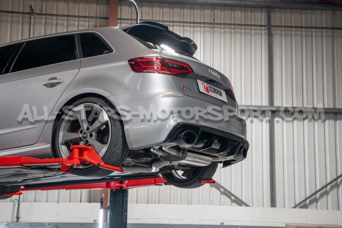 Este escape Scorpion, hecho de acero inoxidable con un diámetro de 3.15 "/ 80mm se instala, sin modificaciones, desde los catalizadores secondarios en los Audi RS3 8V 15-17. Disponible con colas Evo Ascari en fibra de carbon, con o sin válvulas de escape que funcionan con el modo deportivo de serie y con un tubo central equipado o no con resonador que permite reducir el ruido a velocidad constante.