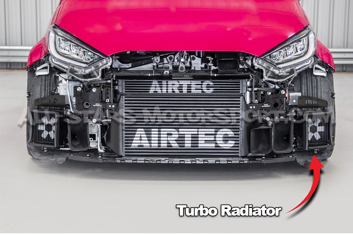 Diseñado para optimizar la refrigeración del circuito de sobrealimentacion de los motores G16E-GTS de los Toyota Yaris GR Gen.1, este radiador de turbo adicional Airtec se instala sin modificaciones en el paso de rueda izquierdo y se conecta al cricuito de enfriamiento de serie. Ideal para uso en circuito o para vehículos con un alto nivel de preparación, este radiador auxiliar Airtec se entrega listo para instalar en un vehículo de serie como equipado con los accesorios de la marca (intercambiador, radiadores, etc...)