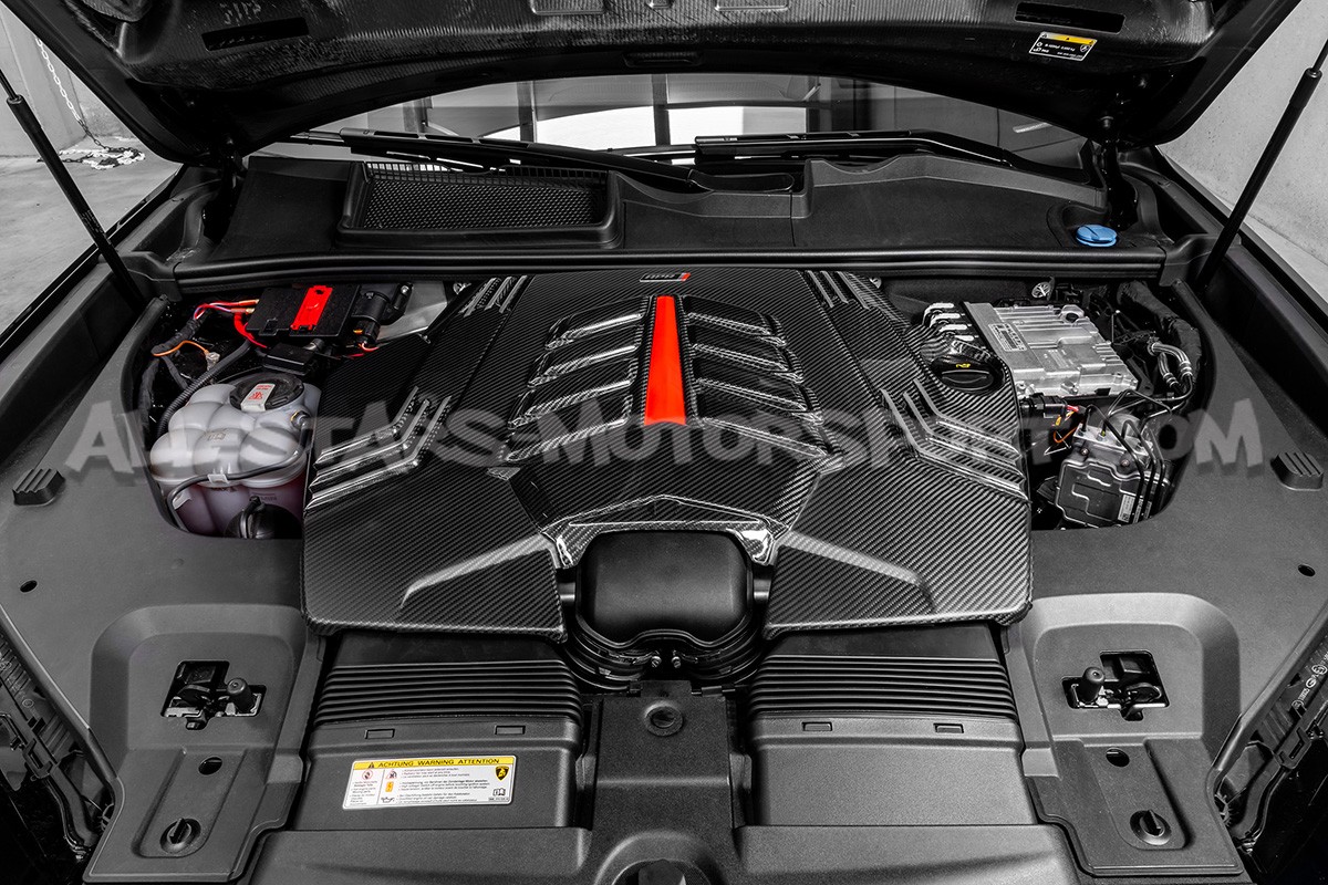 Esta tapa de motor APR, fabricada en fibra de carbono, tiene un acabado brillante con insercion roja en la parte central y un acabado mate en los laterales para integrarse a la perfección con la firma estética del vano motor de los Audi RSQ8 / Lamborghini Urus. Reemplazo directo de la tapa del motor que equipa de serie las motorizaciones 4.0T, este accesorio de APR es un 32% más ligero y se adaptará perfectamente a un motor original o como complemento al sistema de admisión de la marca.