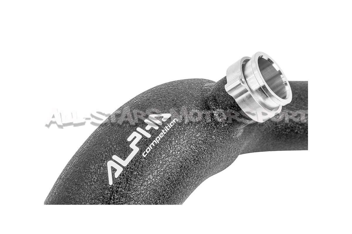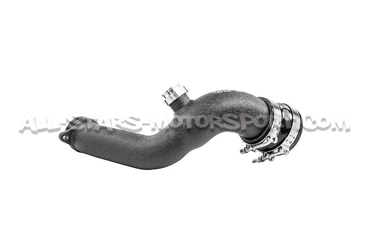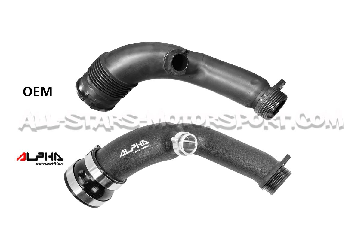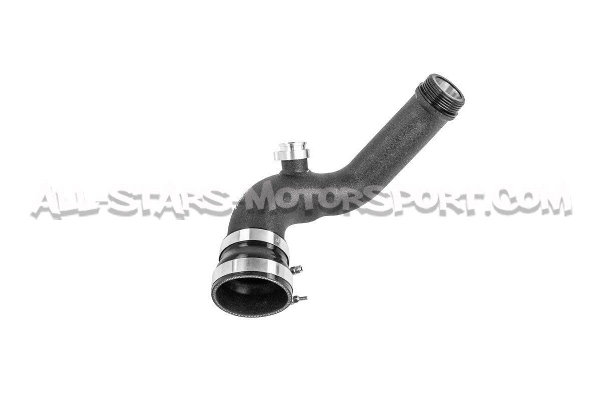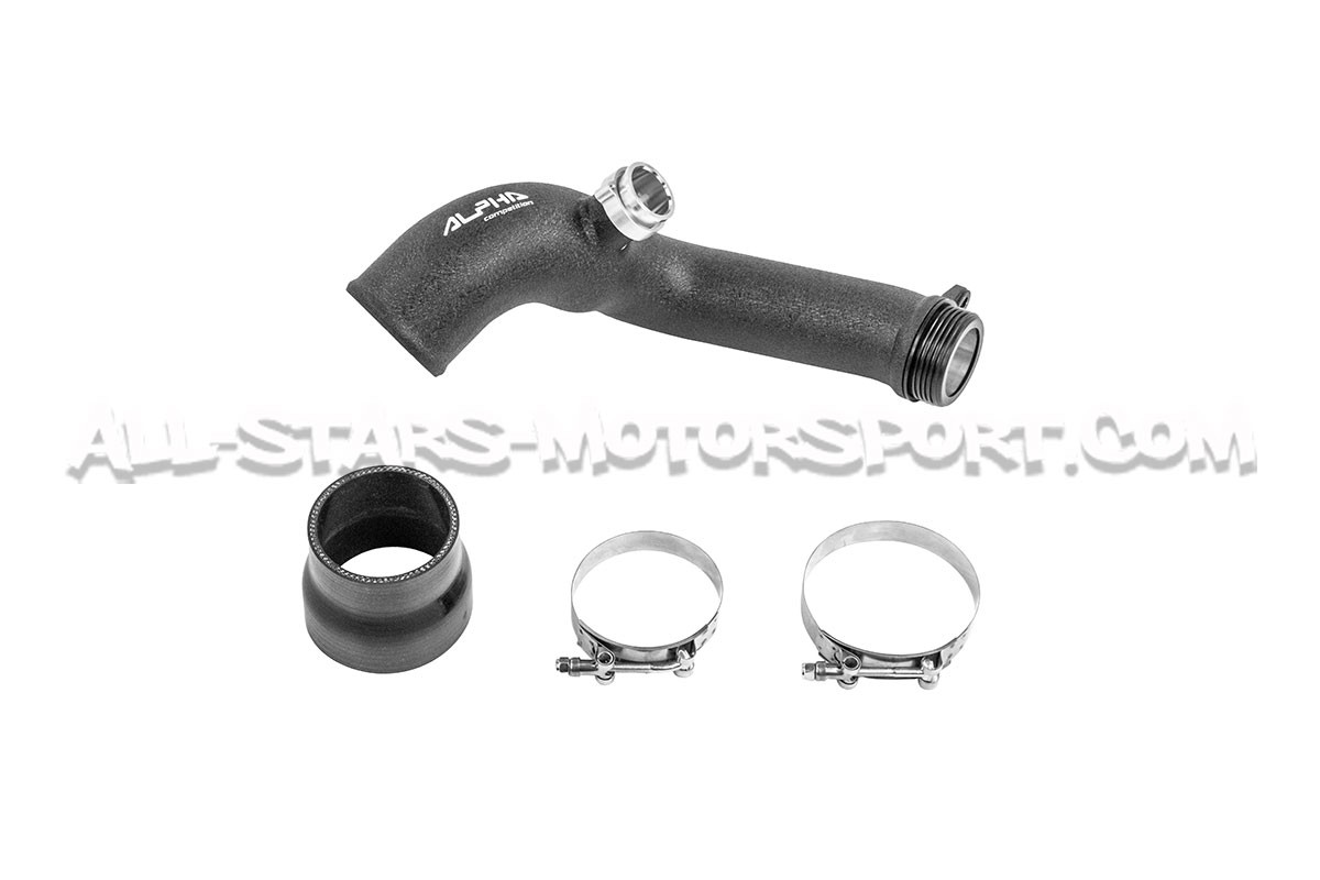 Este codo de entrada de turbo, también llamado inlet de turbo Alpha Competition, se instala sin modificación en los turbos instalados en los motores N55 de los BMW 135i / 235i / 335i / 435i y M2 F-series. Con un volumen un 21% superior al de serie, una estructura de aluminio de alta calidad y un acabado negro muy discreto, este inlet de turbo será una evolución perfecta para aumentar los caudales de aire del sistema de admisión y soportar altas potencias y presiones sin riesgo de rotura .