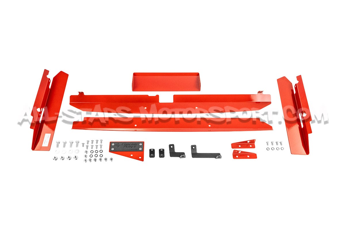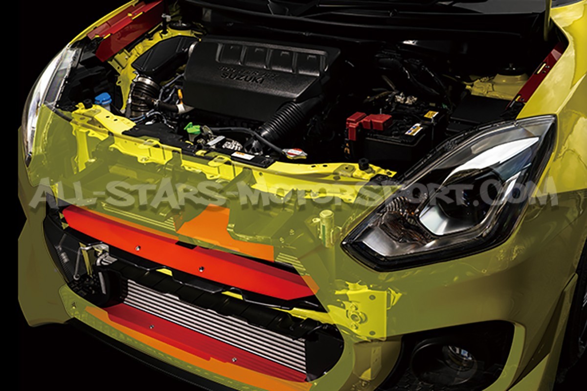 En uso intensivo, la temperatura en el compartimiento del motor de los Suzuki Swift Sport ZC33S alcanza niveles particularmente altos debido a las bajas fuentes de enfriamiento y la posición del turbo, todo lo cual puede alterar el rendimiento y la confiabilidad del motor K14C. Para reducir esta temperatura, Tanabe ha desarrollado este kit de difusores de aire llamado placa de enfriamiento, que permite canalizar y difundir los flujos de aire desde la parrilla delantera del vehículo. Compuesto por placas de radiador superior y inferior, un difusor central y obturadores laterales este kit ofrecerá un descenso de 5°C en la temperatura del motor y aportará un toque agresivo al compartimento del motor gracias a su magnífico acabado en rojo.