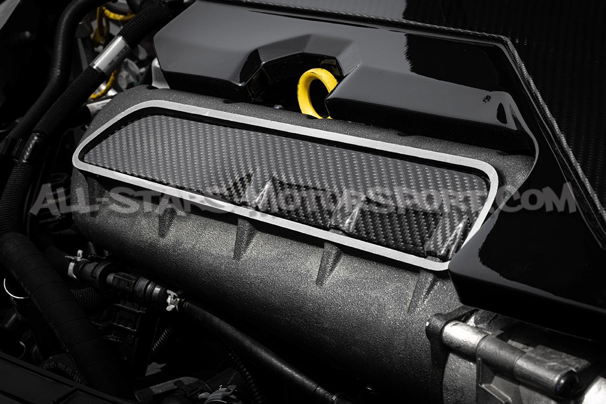 Este inserto de colector de admisión APR, fabricado en fibra de carbono con acabado brillante, sustituye sin modificaciones al inserto que equipa de serie los motores 2.5 TFSI de los Audi RS3 / TTRS y RSQ3.