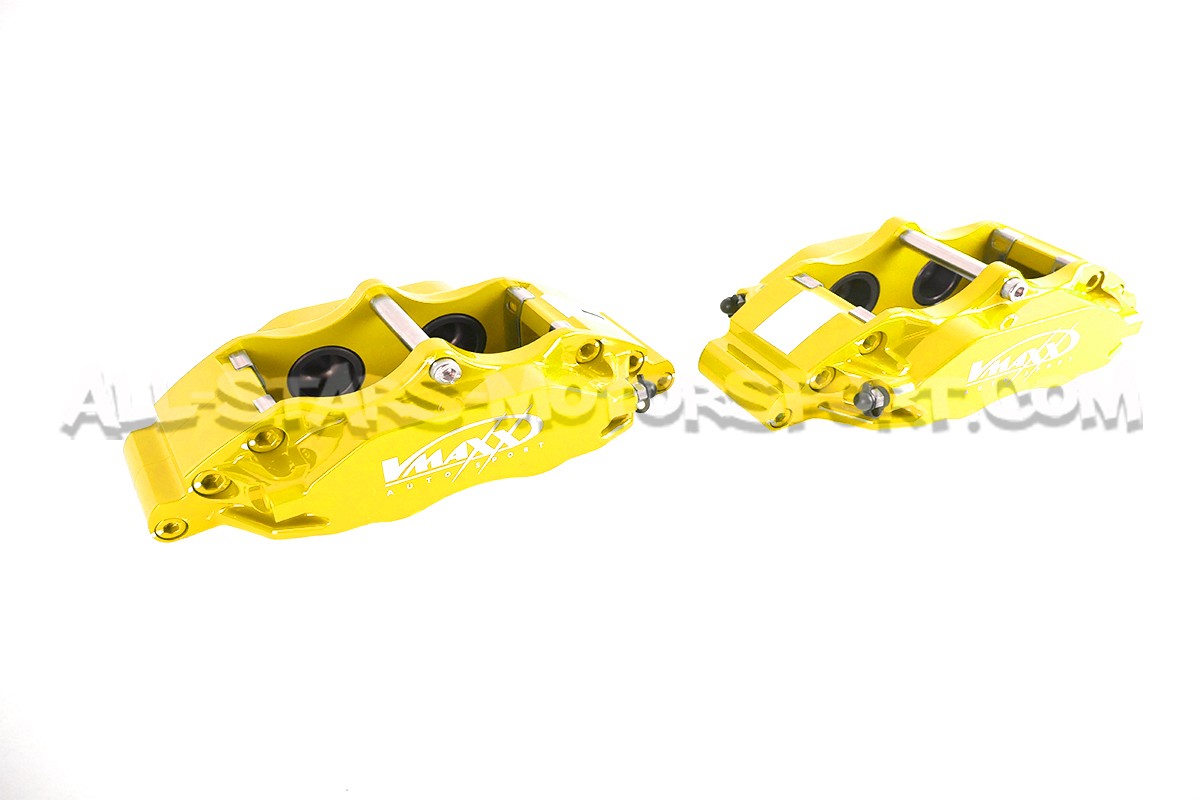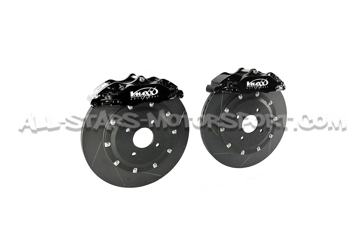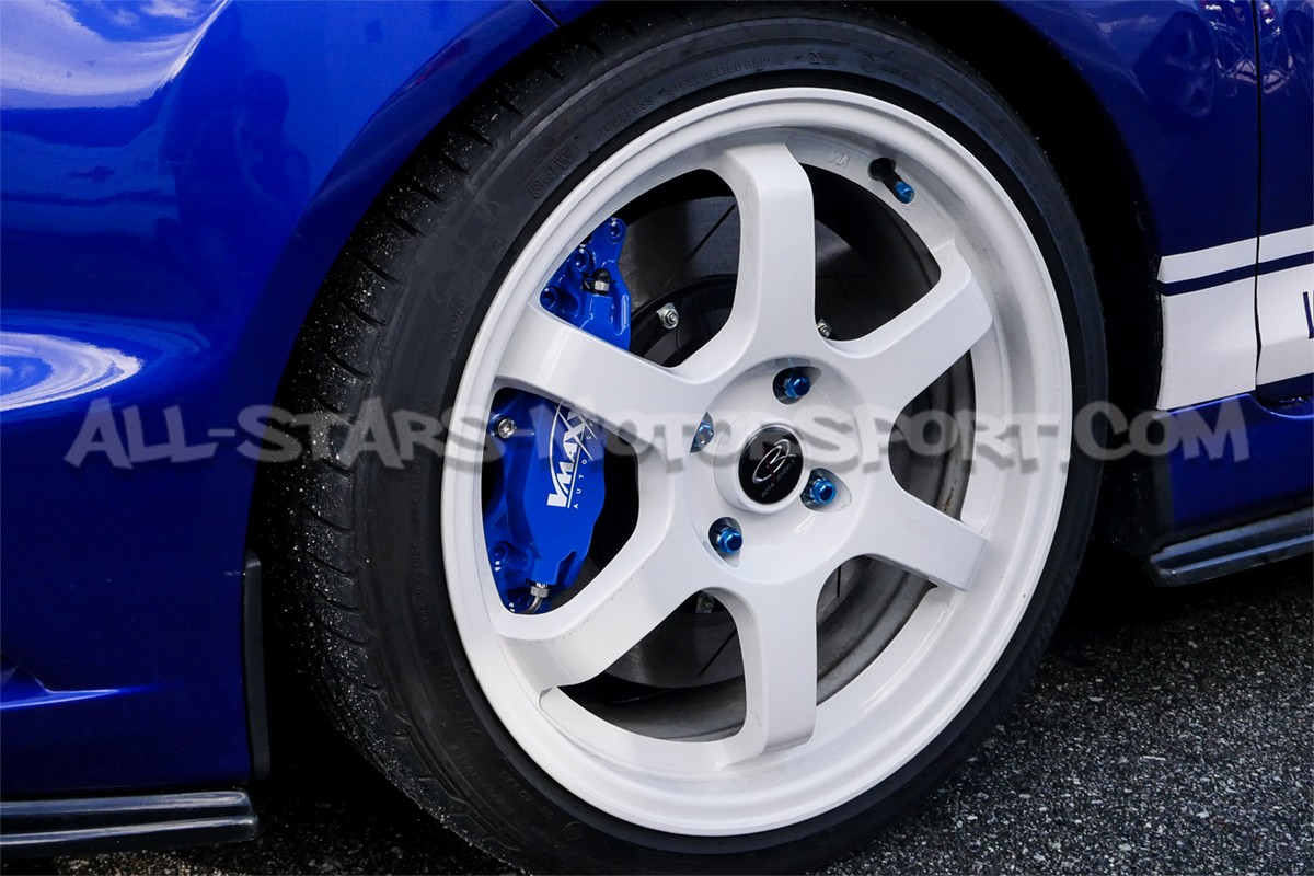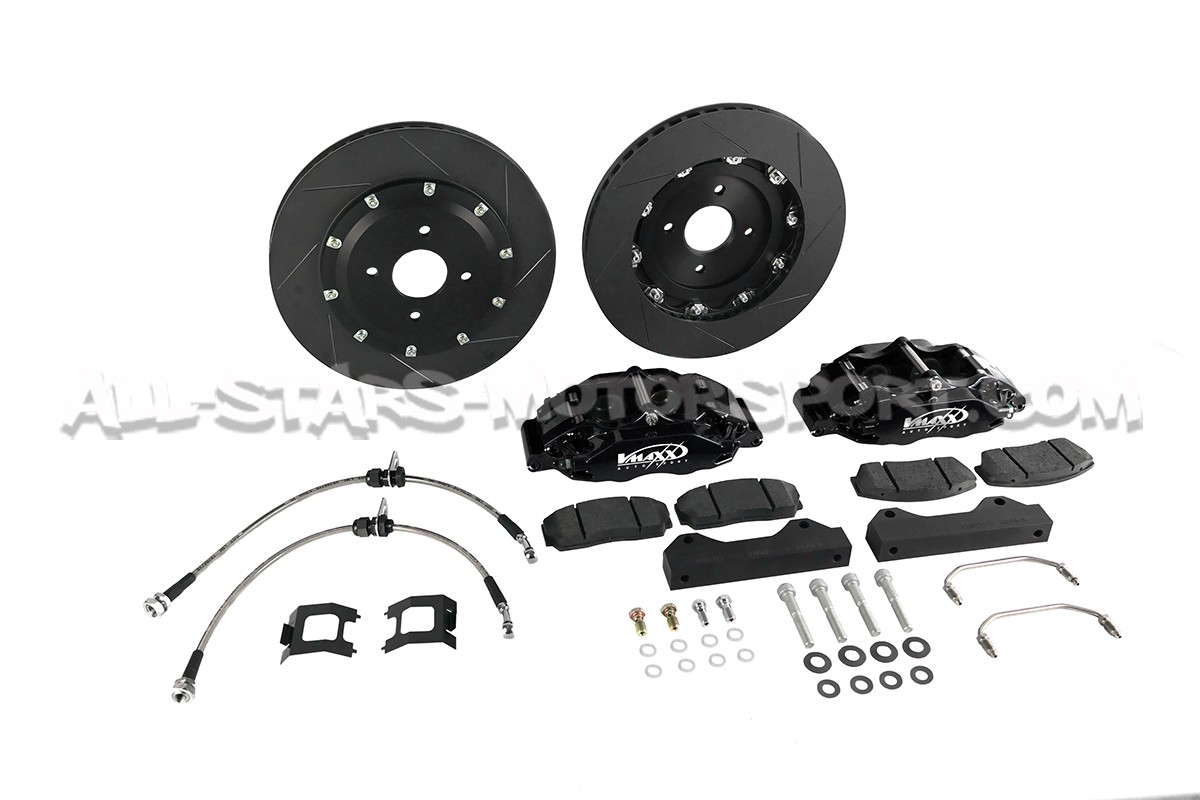 Kit gros frein avant Vmaxx pour Ford Fiesta MK7 ST 180 / 200 comprenant les etriers 4 pistons, les disques sur bol rainurés / ventilés en 330mm, les flexibles de frein aviation, les plaquettes route / sport et tout le nécessaire de montage pour une installation directe sans aucune modification.