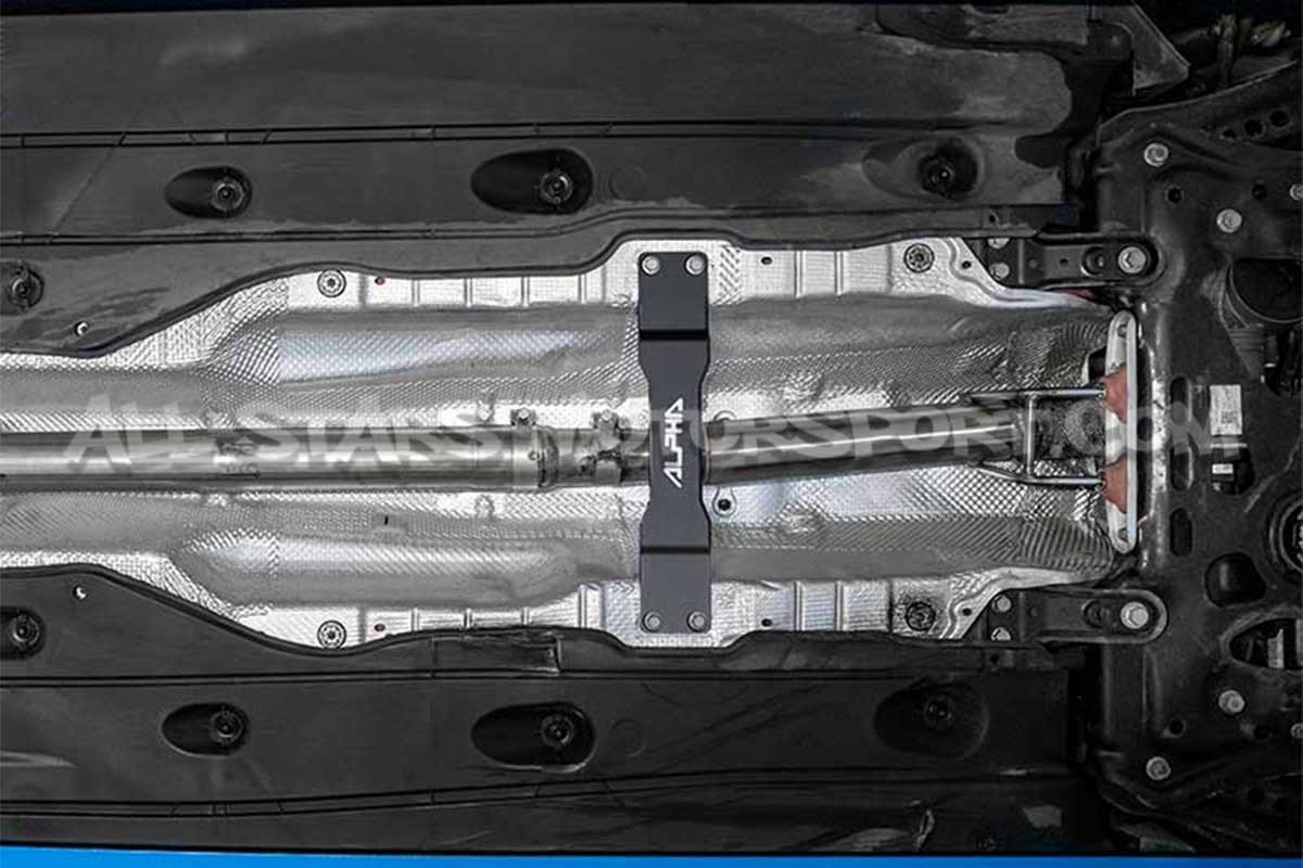 Cette barre de renfort inférieure centrale Alpha Competition, destinée aux chassis MQB et MQB Evo des Audi A3 / S3 / RS3 8V et 8Y, des Golf 7 / 8 GTI et R, des Leon 3 Cupra ou des TT Mk3 s'installe sans modification en remplacement de la barre en acier d'origine. Bien plus large, rigide et resistante que celle de série, cette barre de renfort permettra de rigidifier le véhicule afin de gagner en precision et en agilité, tout en offrant plus d'espace pour le passage d'un échappement de gros diamètre sans nécessiter la modification ou la suppression du renfort.