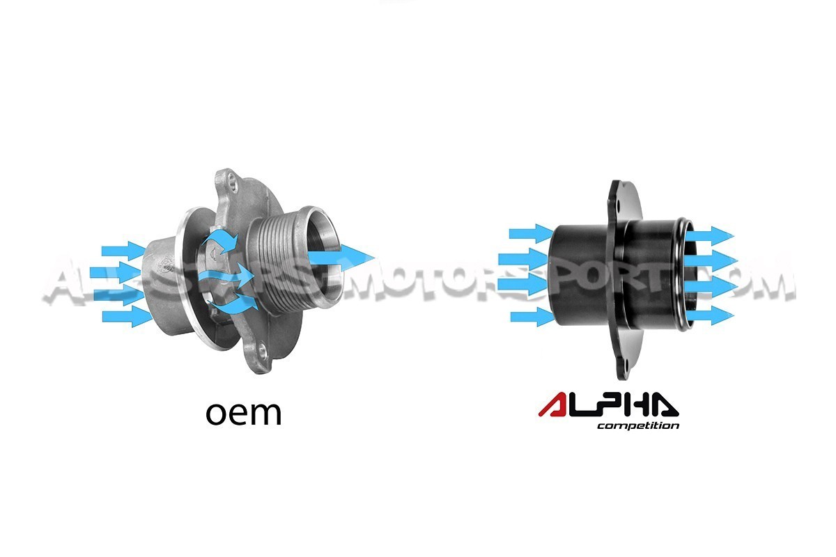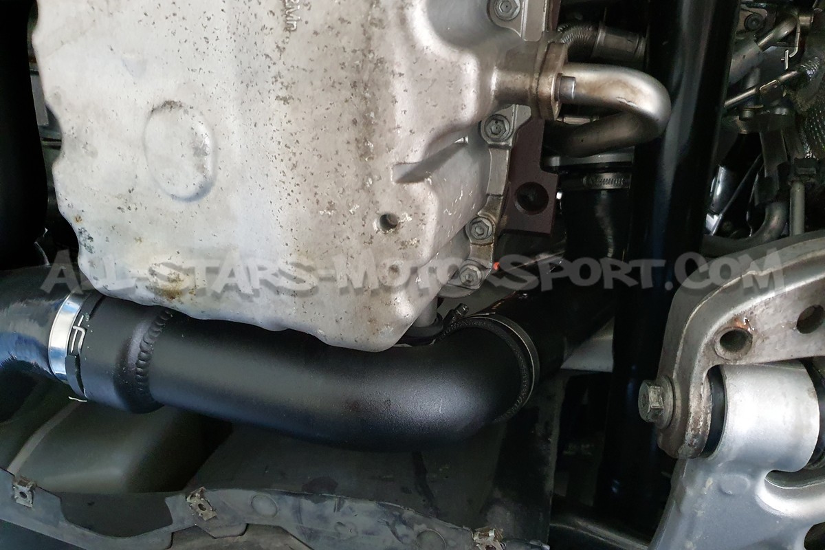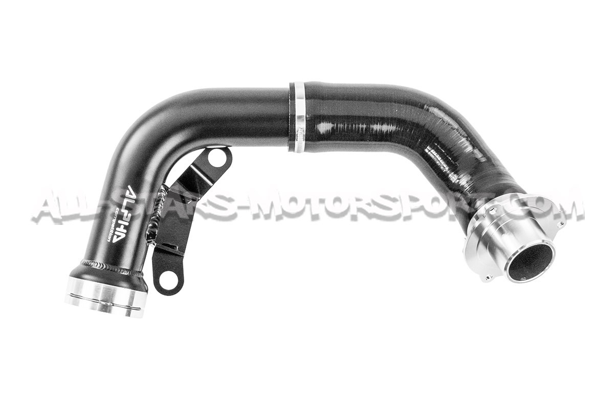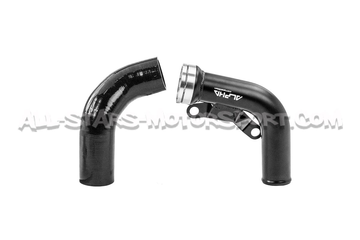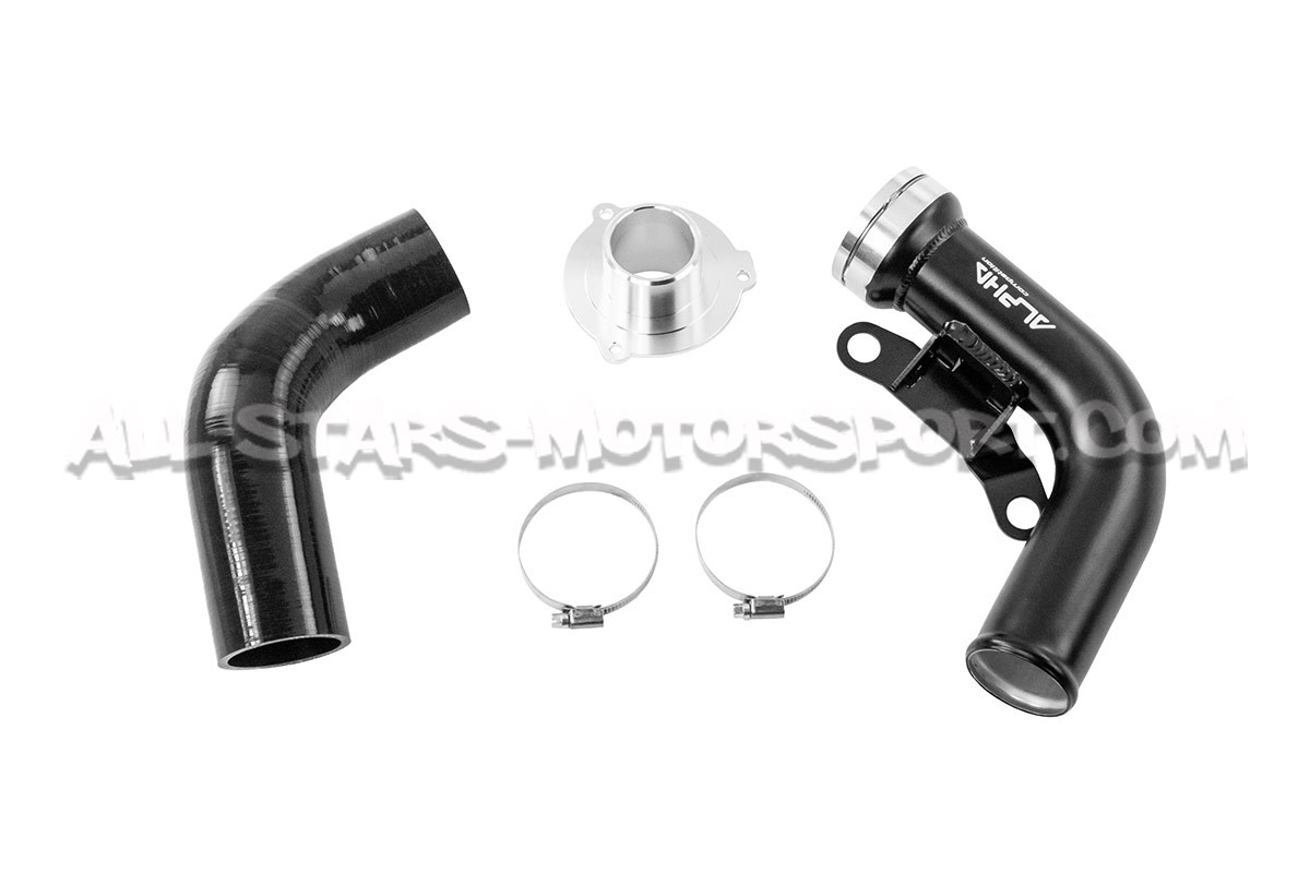 S'installant en remplacement direct des éléments de série sur les moteurs 2.0 TFSI EA113 équipant les Golf 6 R / S3 8P ou Leon 2 Cupra, ce kit outlet Alpha Competition comprend un tube en aluminium, un raccord silicone et un muffler delete. Permettant de remplacer le tube de série de diamètre réduit, reliant le turbo K04 à l'échangeur, ce kit apportera un gain concret de puissance a haut régime (5 a 7cv), un meilleur temps de réponse et un son de charge plus présent.