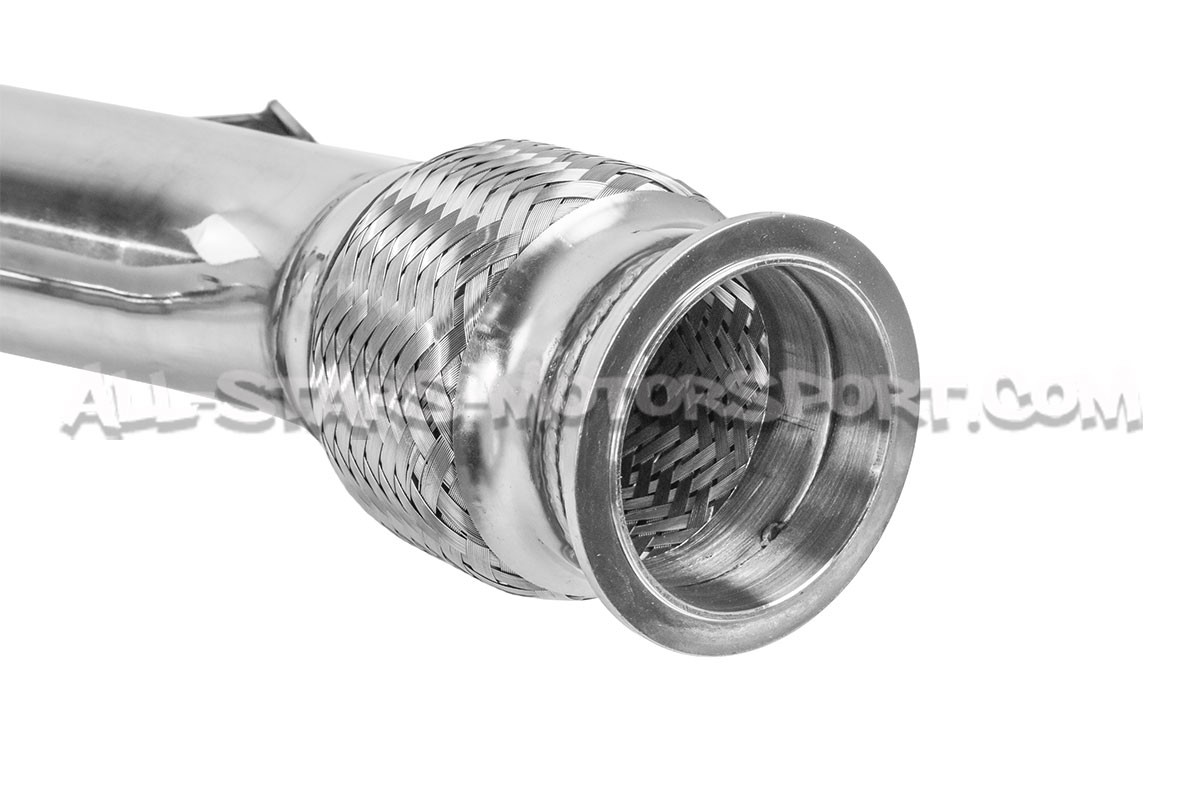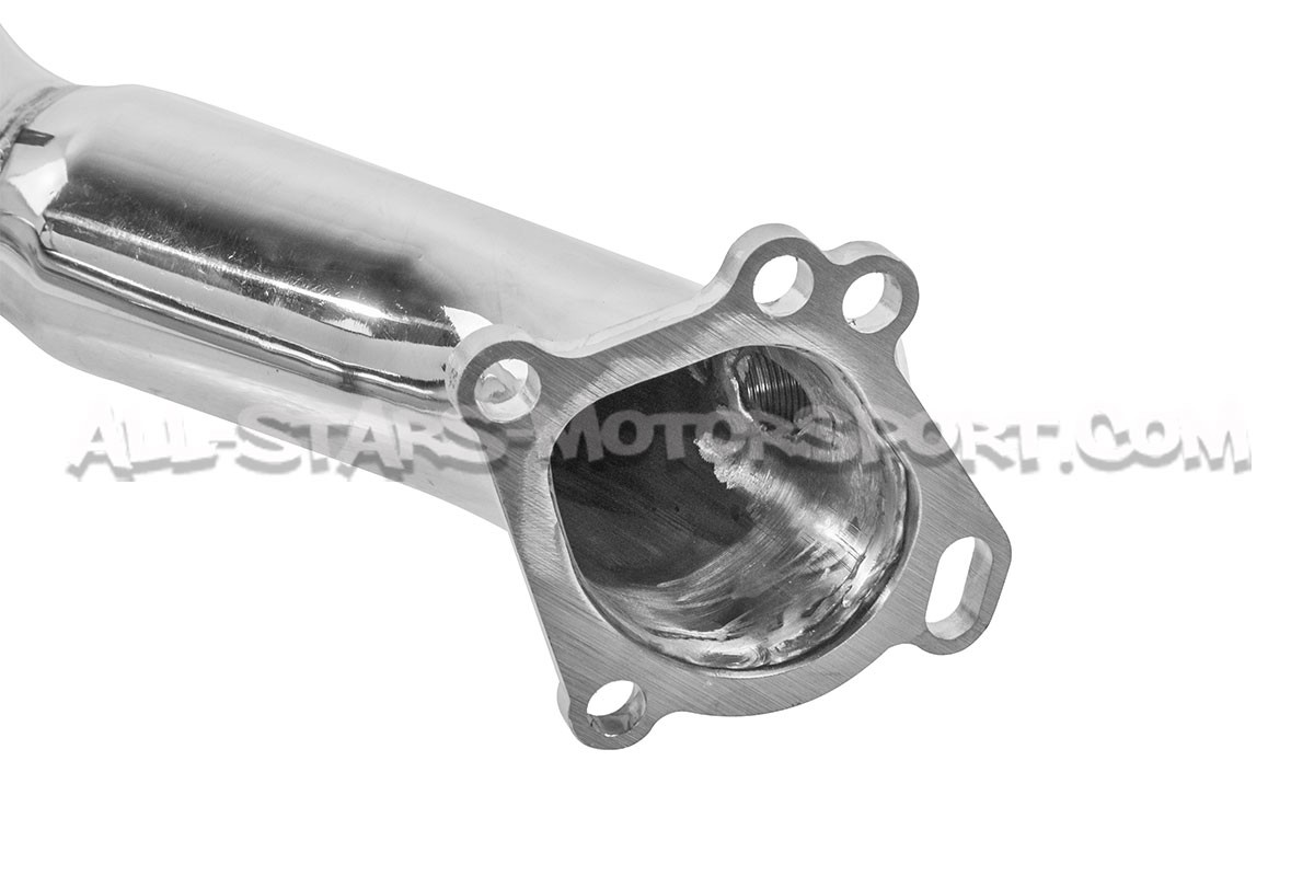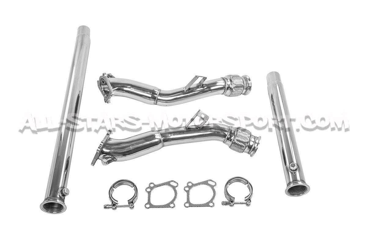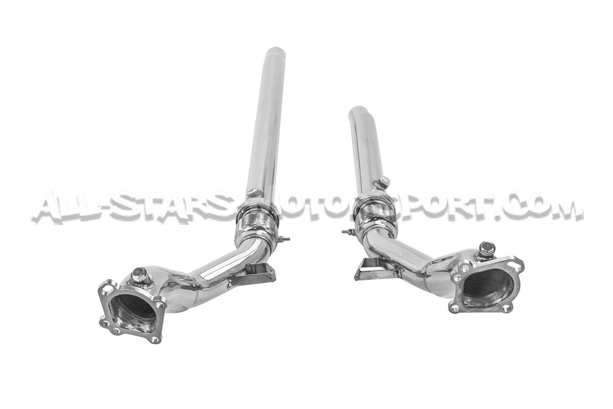Downpipes avec decatalyseur tout inox Alpha Competition en diamètre 2.5" / 63.5mm se plaçant entre les turbos et les tubes centraux sur Audi RS4 et S4 B5. Ce kit downpipes équipées de double flanges pour turbo RS4 / RS6 constitue clairement le meilleur rapport qualité / prix du marché avec une conception full flow, un inox T304 haute qualité et des soudures TIG realisées à la main !
