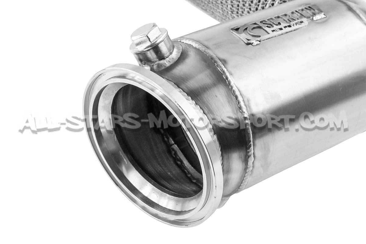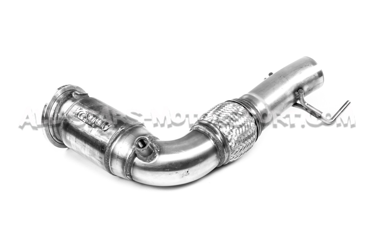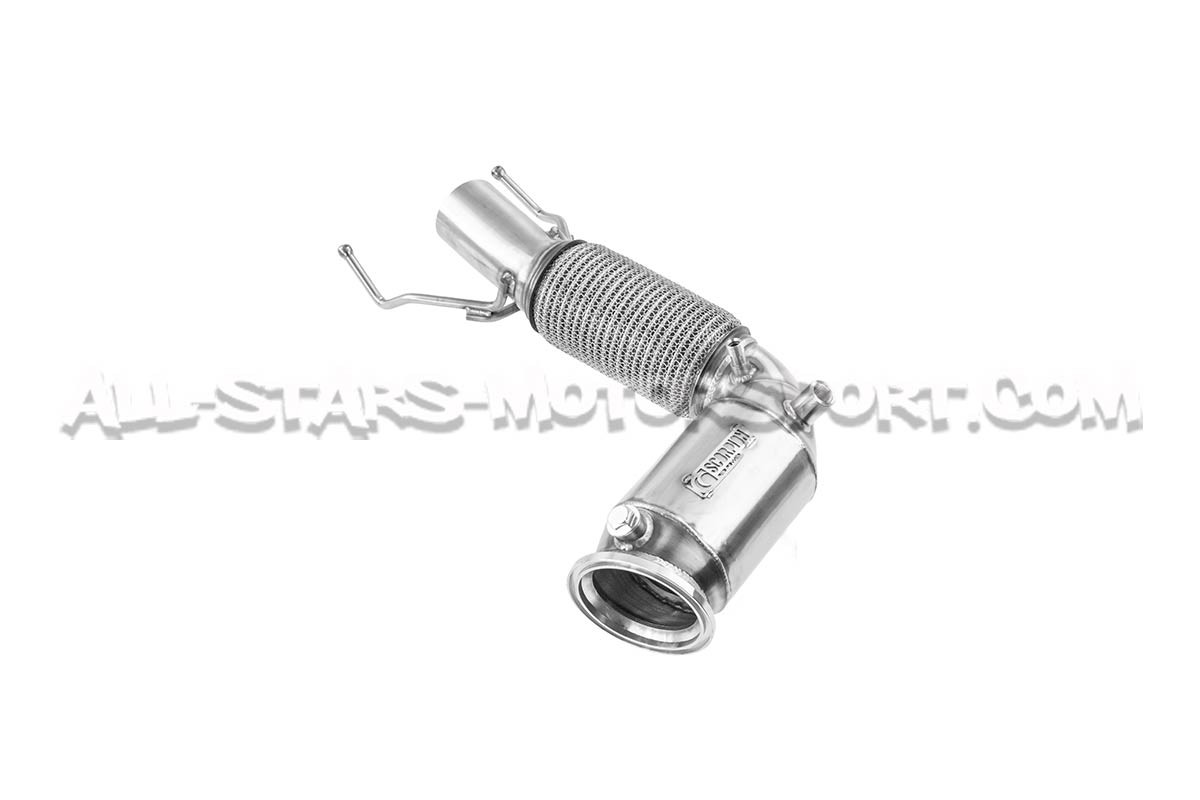 Cette downpipe avec cata sport tout inox Scorpion en diamètre 2.75" / 70mm, s'installe sans modifications entre le turbo et le tube avant de série ou sport des Mini Cooper S / JCW / GP3 F56 équipées ou non d'un filtre à particule (FAP / GPF) afin de remplacer le catalyseur principal.