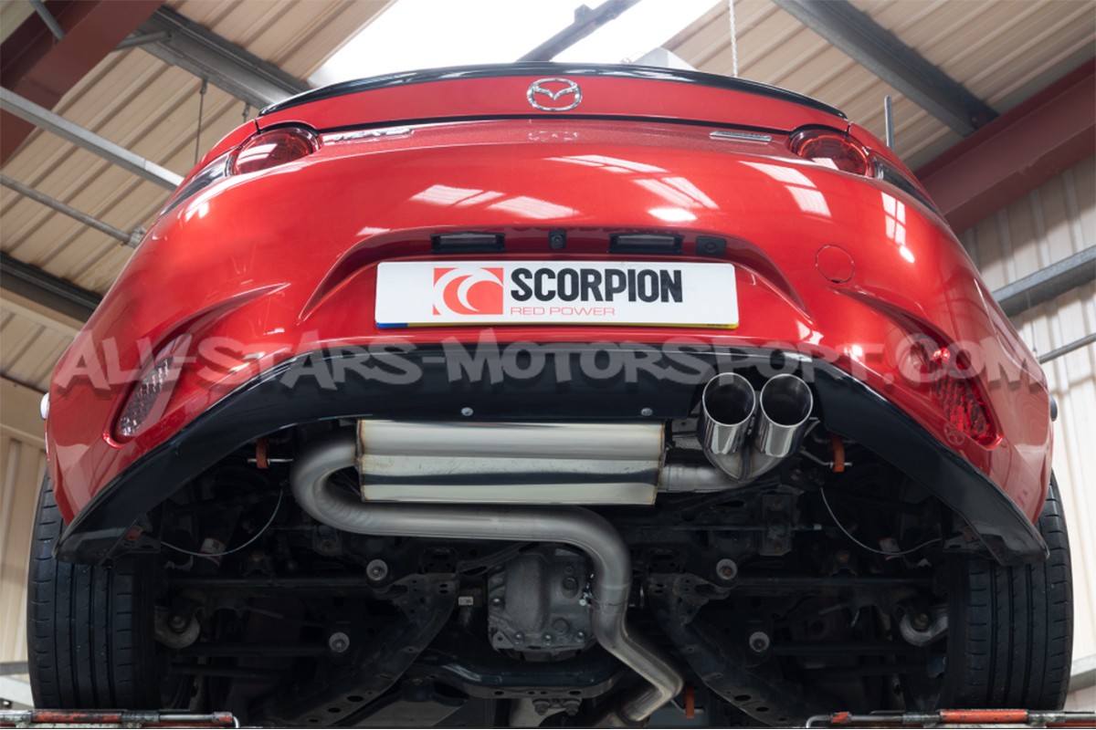 Echappement après catalyseur tout inox Scorpion en diamètre 2.5" / 63 mm, s'installant sans aucune modification sur Mazda MX5 ND. Ce catback est disponible avec des embouts en finition polie et avec un tube central équipé ou non d'un résonateur permettant une atténuation du bourdonnement a régime stabilisé