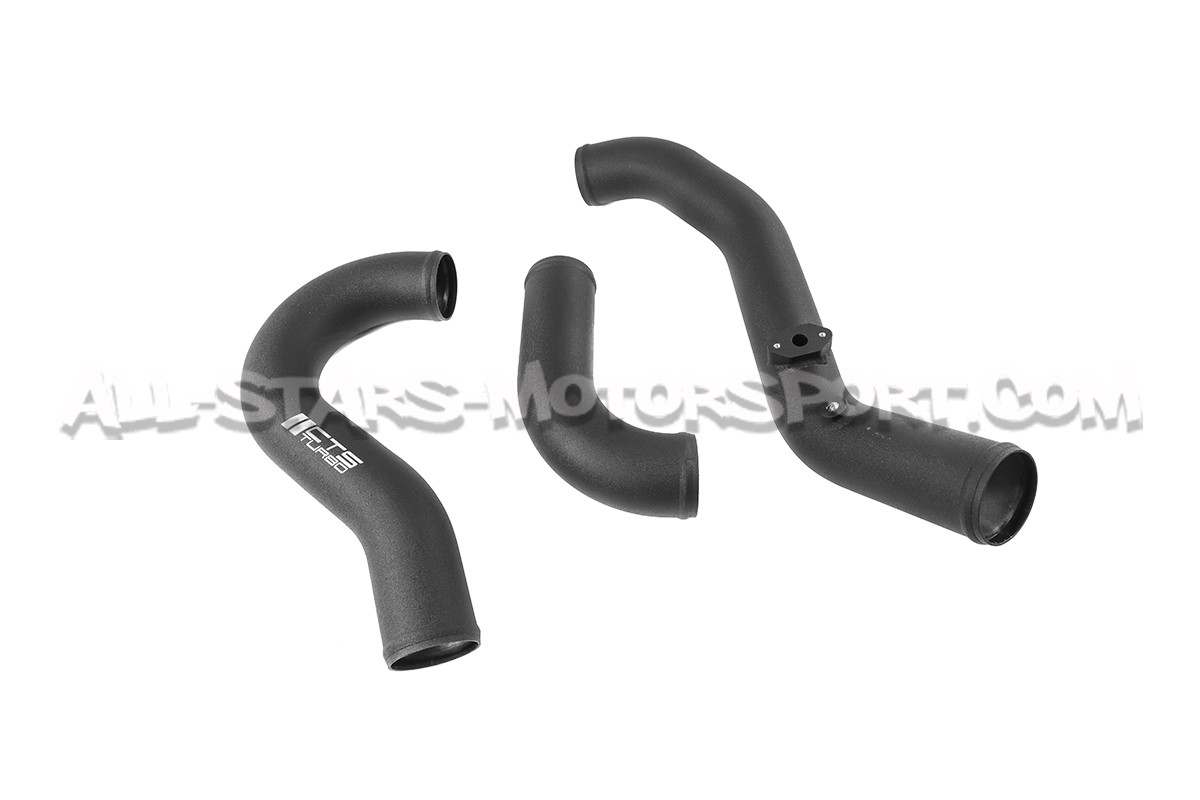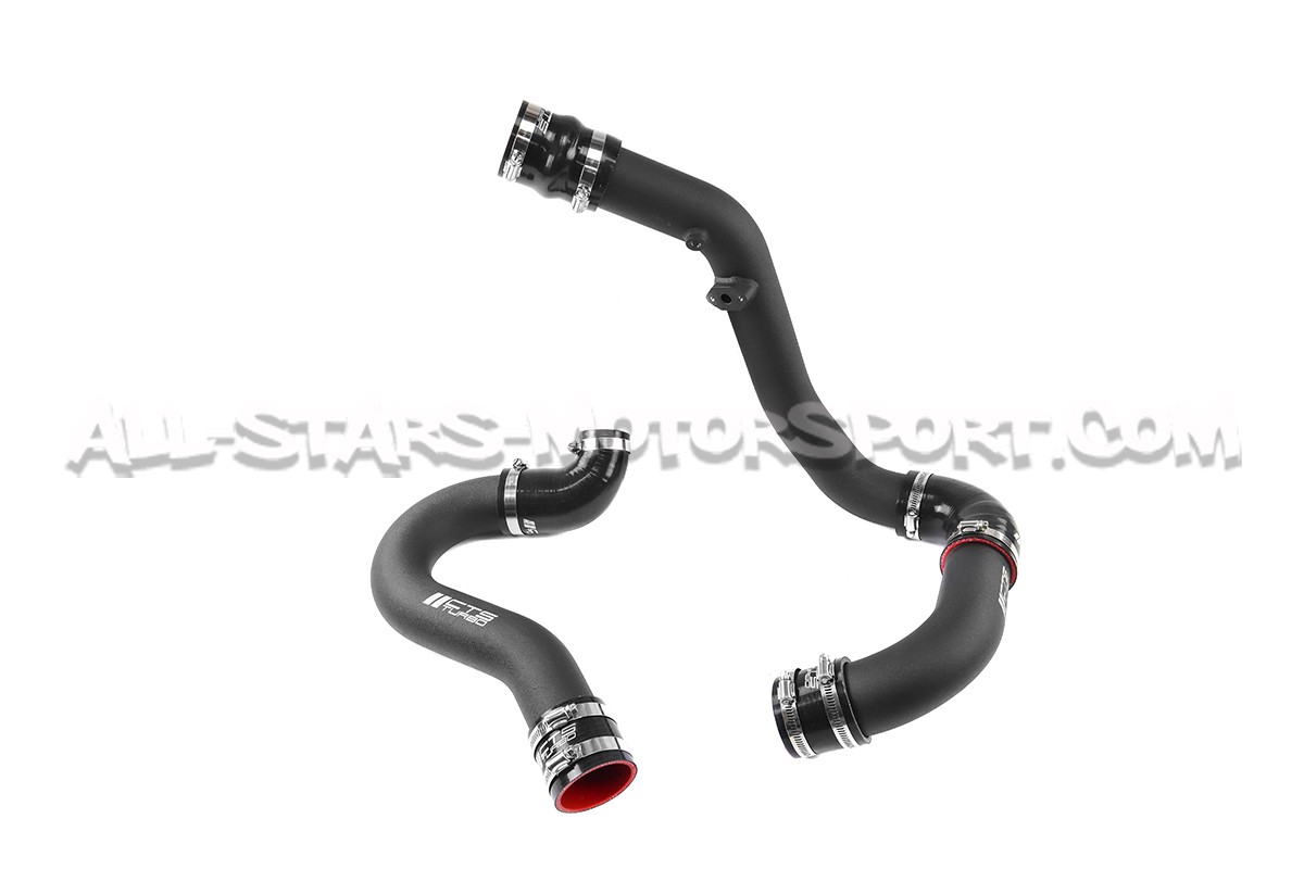 Spécialement conçu pour apporter fiabilité et performance au circuit de suralimentation des moteurs 2.0 TFSI des Audi A4 / A5 B9 ce kit de tubes d'échangeur ou inlet / outlet pipes permet de remplacer les éléments en plastique de série par des tubes en aluminium de gros diamètre, supportant sans aucune problème la pression et la chaleur !