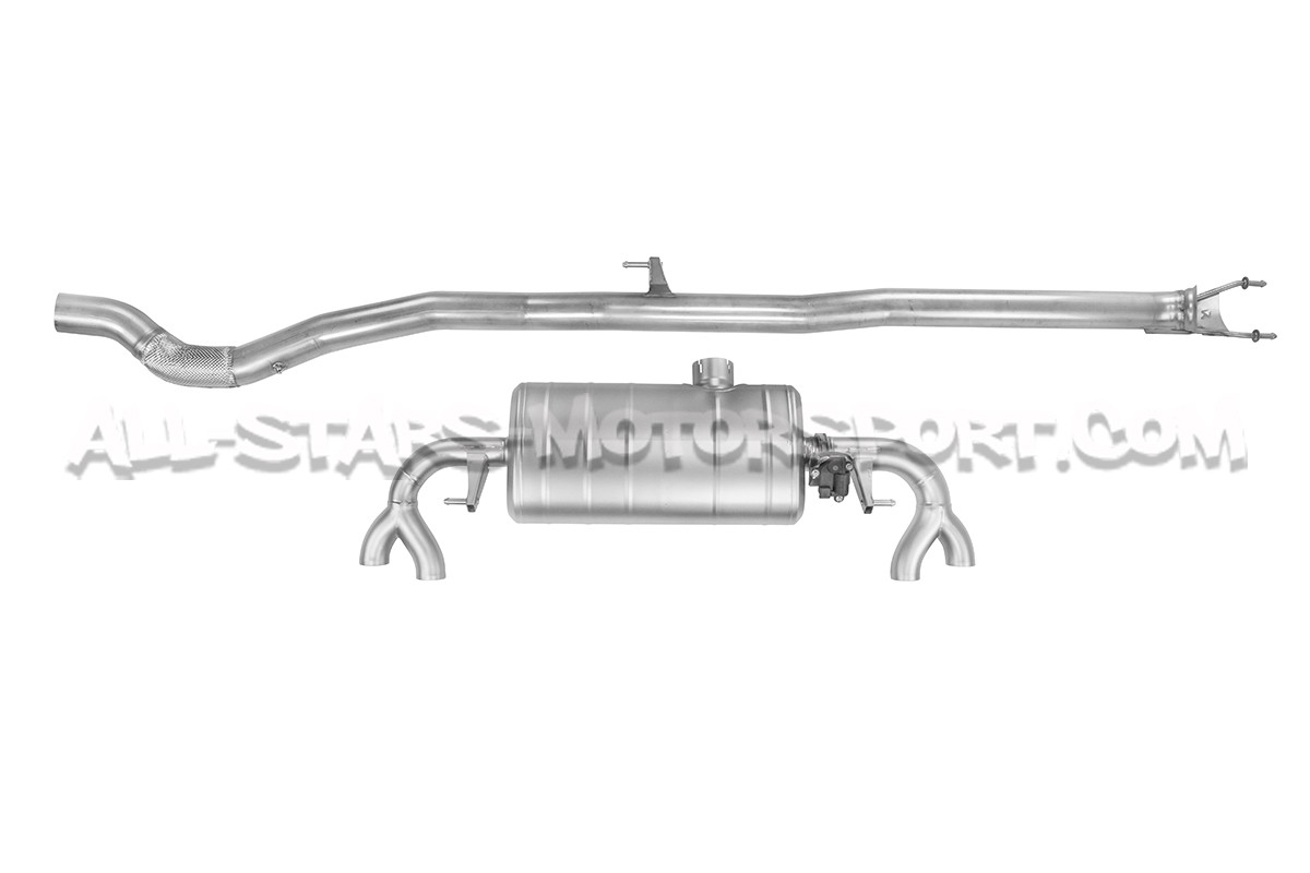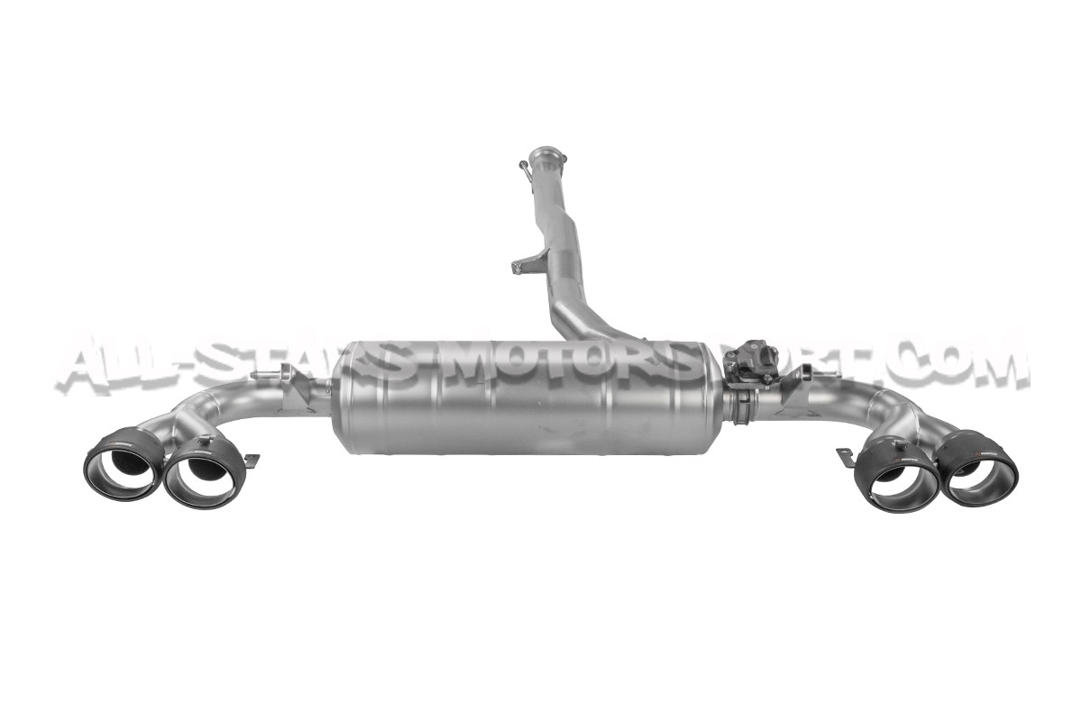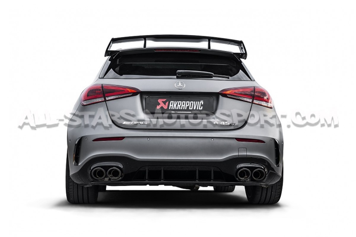 Echappement haute qualité Akrapovic Evolution Line fabriqué en titane pour Mercedes A45 / A45S AMG W177 et comprenant le tube central, le silencieux arrière équipé de valves actives reprenant le bouton de control de série, le tout livré avec des embouts d'échappement en fibre de carbone et le kit de montage complet ! Disposant d'une homologation ECE, cet échappement evo-line permettra un gain de 8.7cv et de 9.6kg sur une base de serie !
